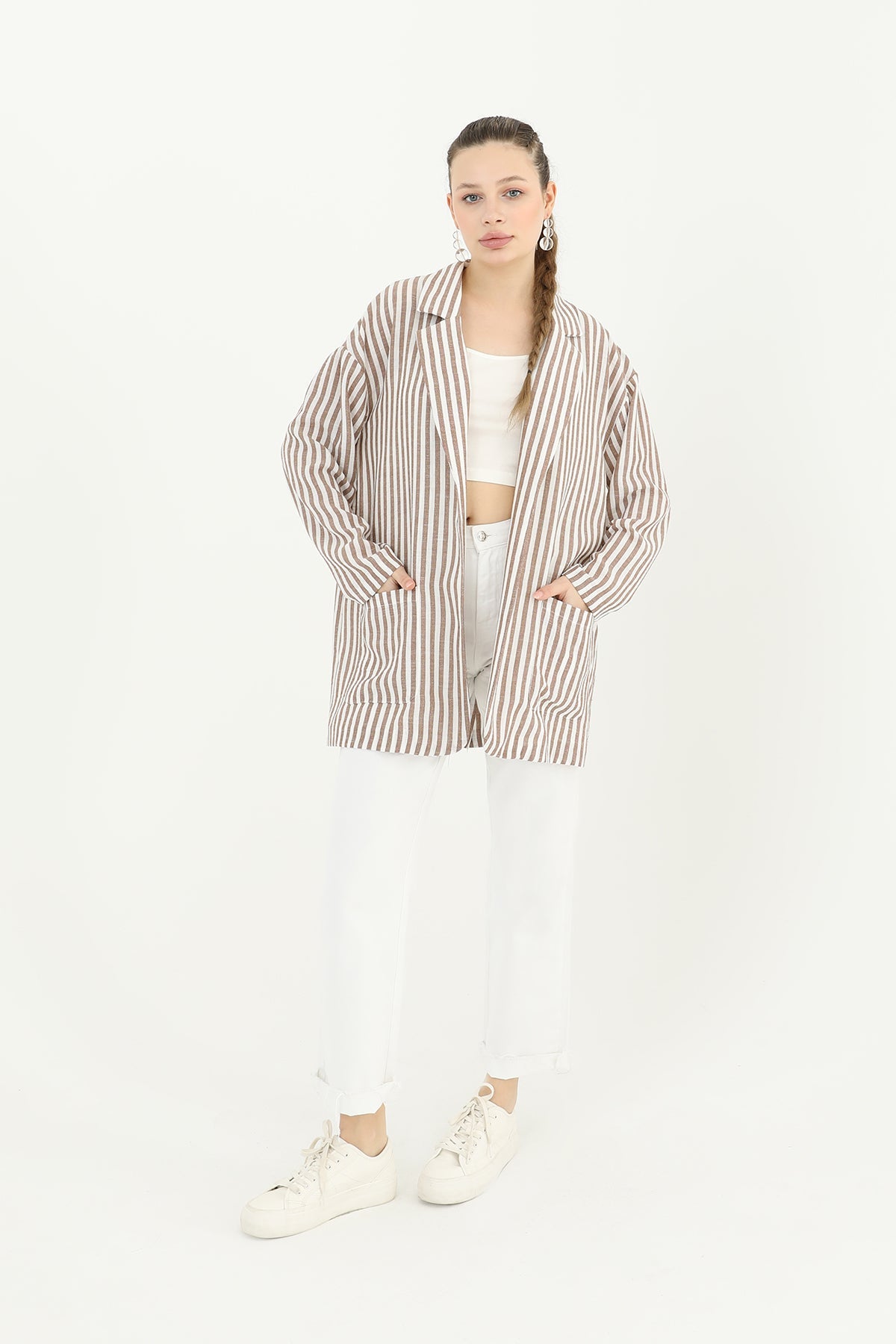 Yaz mevsimine uygun hafif keten kumaştan üretilmiş, çizgili deseni ile zamansız bir tarz sunan bu ceket, serin akşamlar için mükemmel bir seçenek.