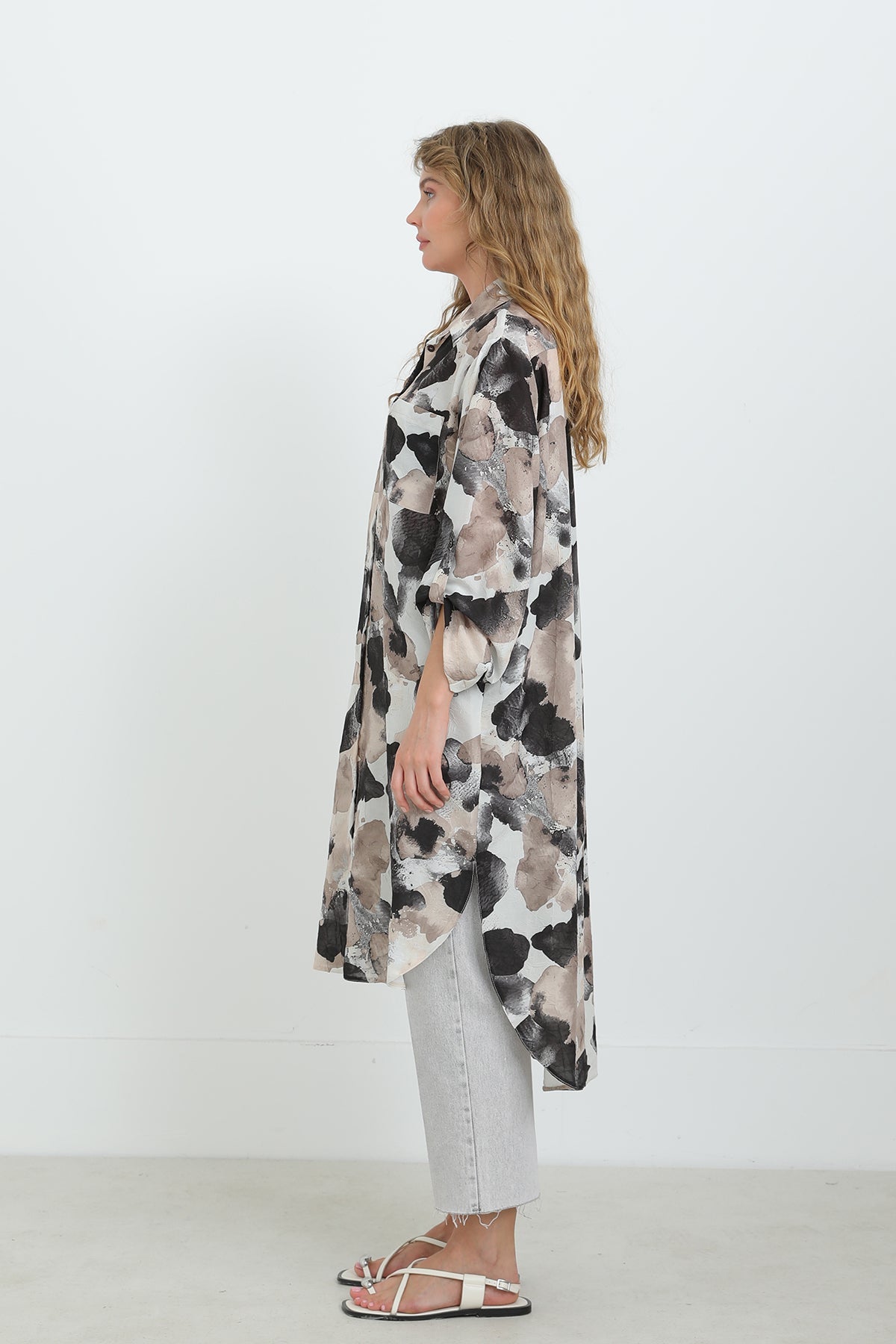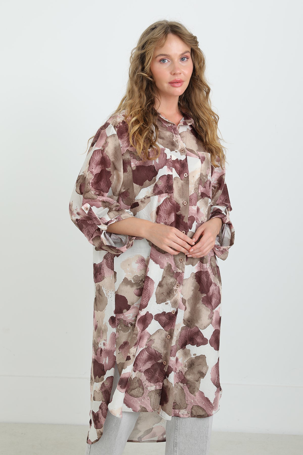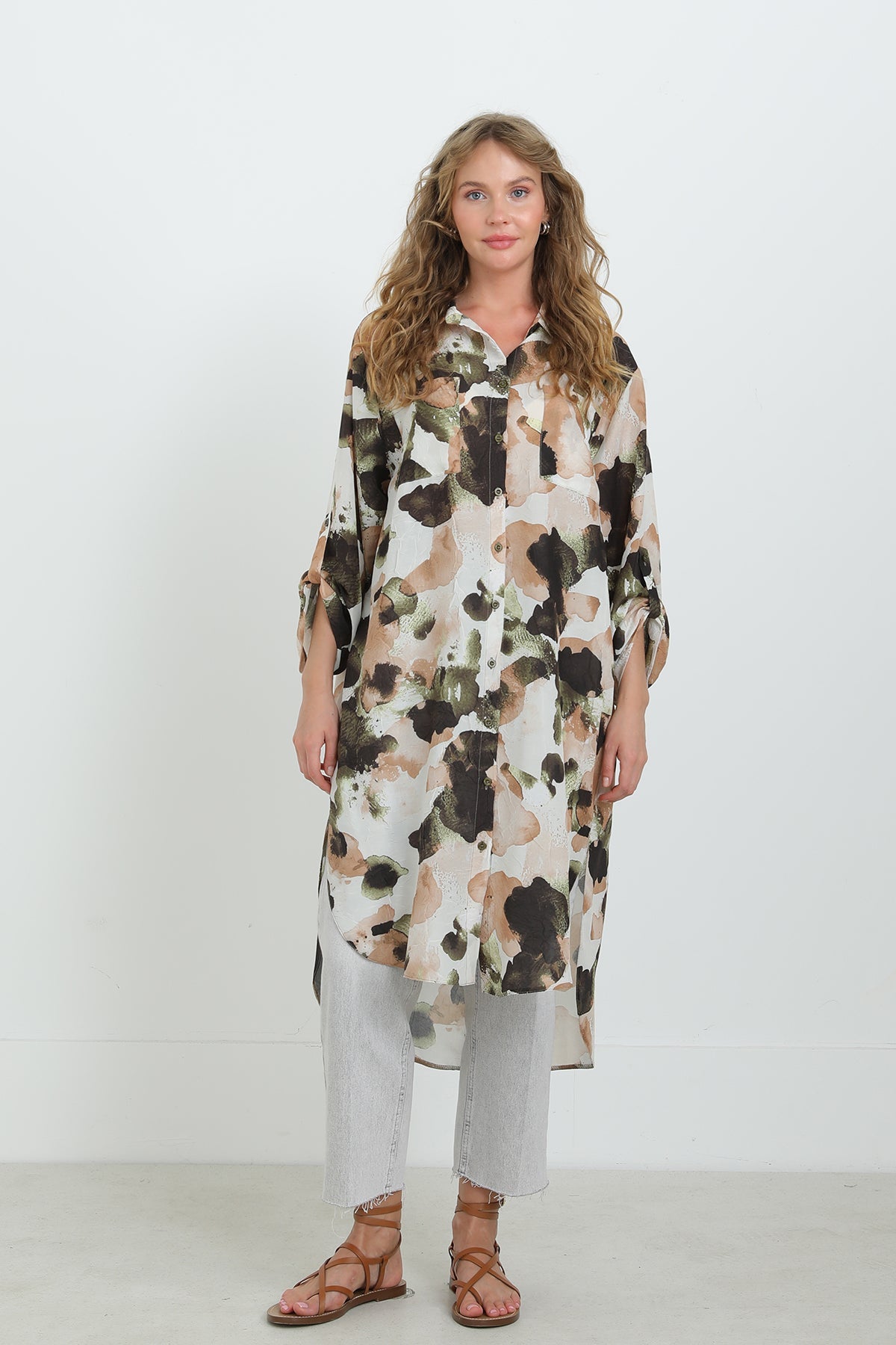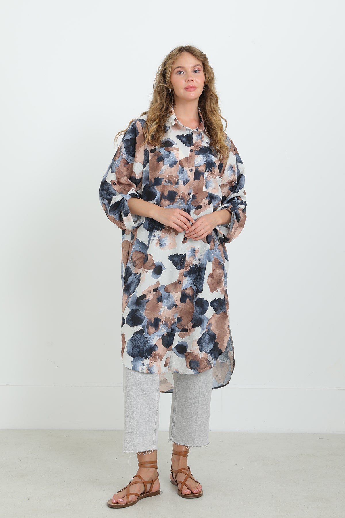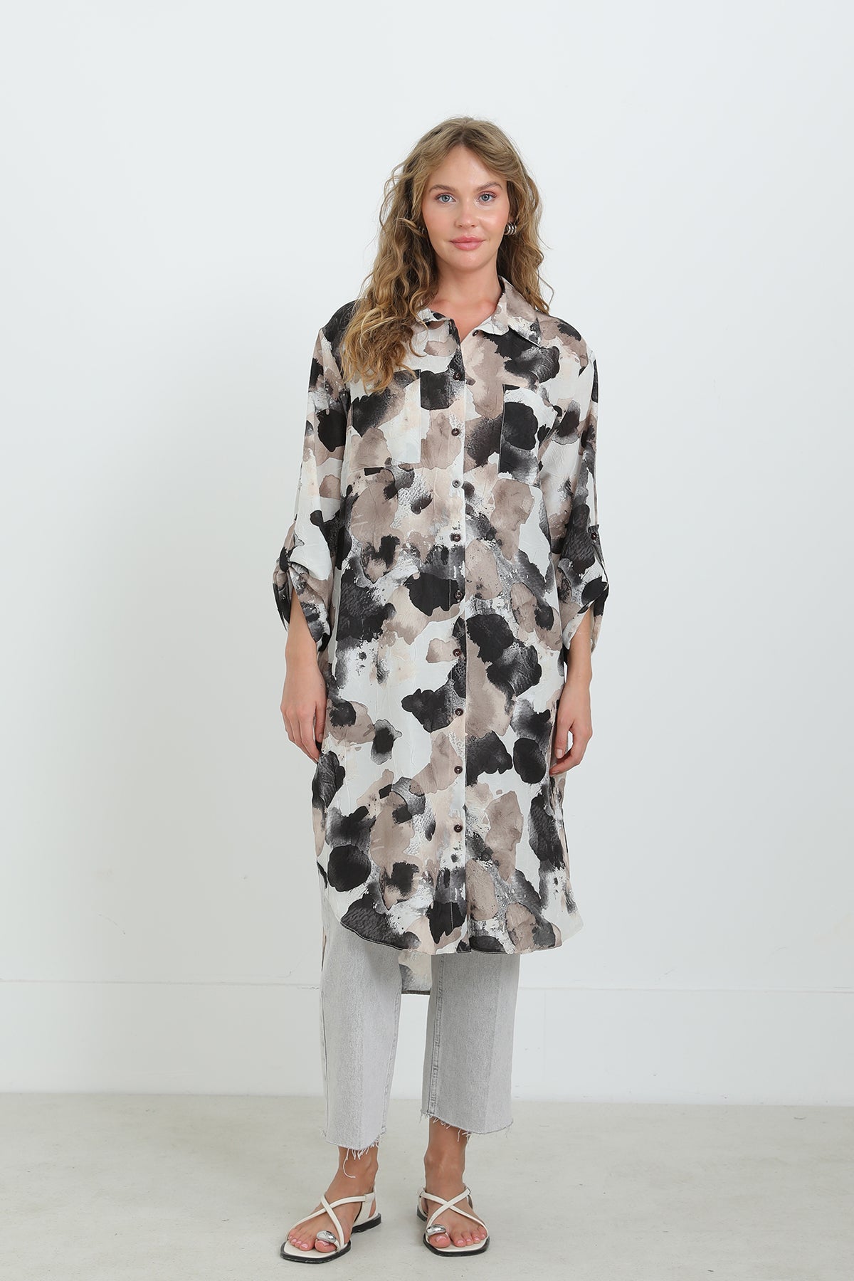 Soyut desenleriyle dikkat çeken bu düğmeli tunik, oversize kesimi sayesinde gün boyu konfor sunar. Hafif ve nefes alabilen kumaşıyla sıcak havalarda vazgeçilmezdir. Gömlek yaka detayı ve yırtmaçlı etek ucu, modern ve zarif bir görünüm sağlar. Pantolonlarla mükemmel uyum yakalar.