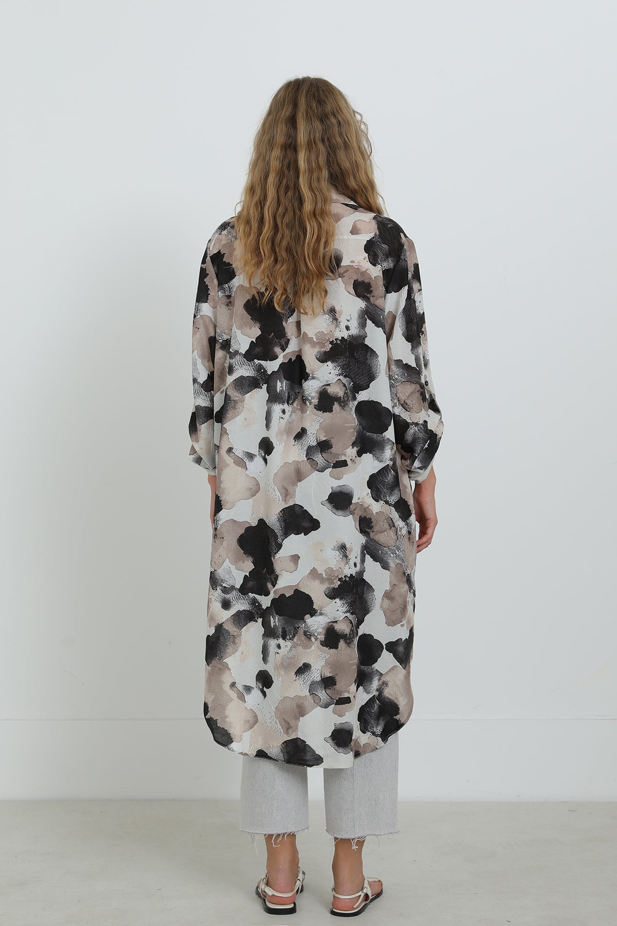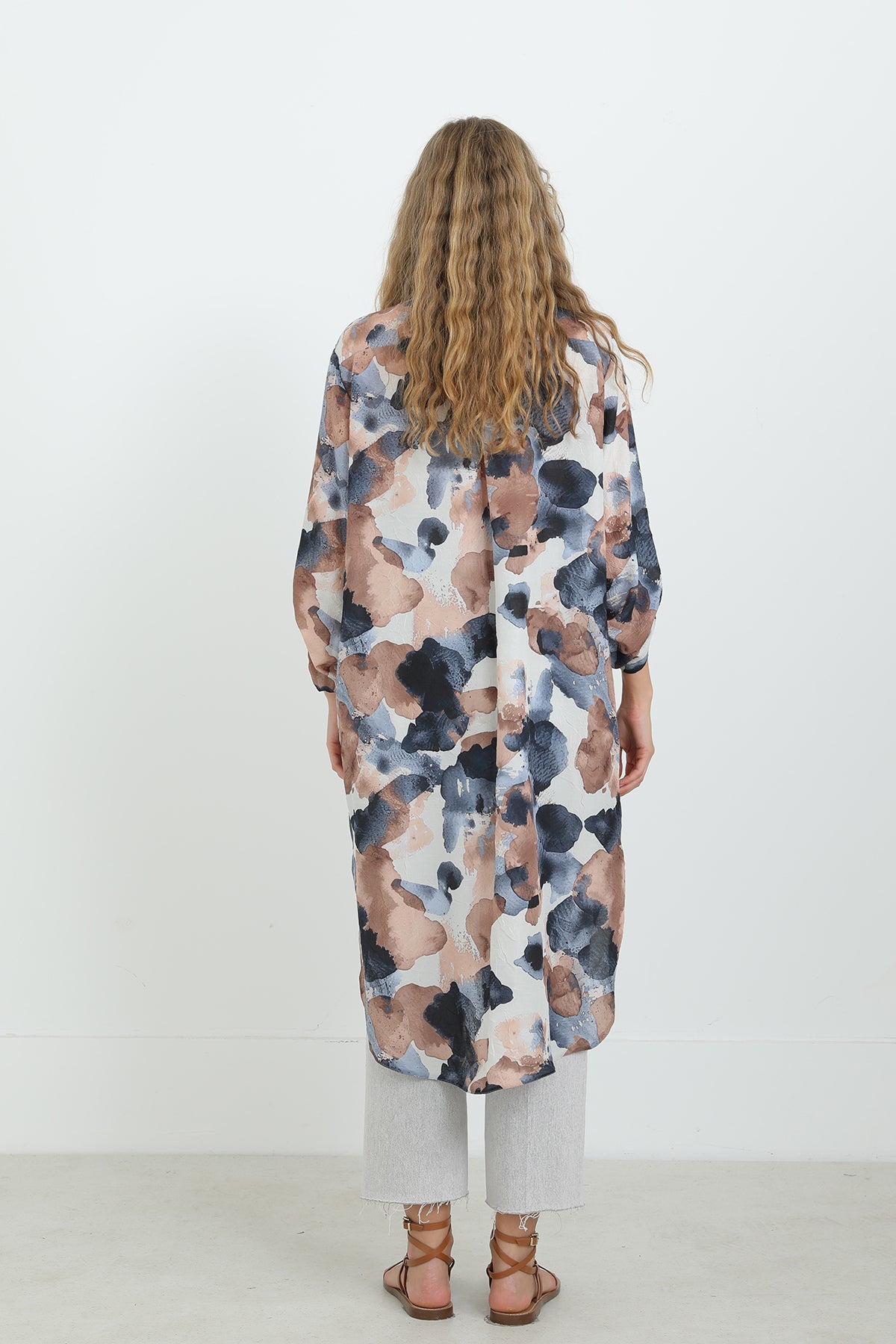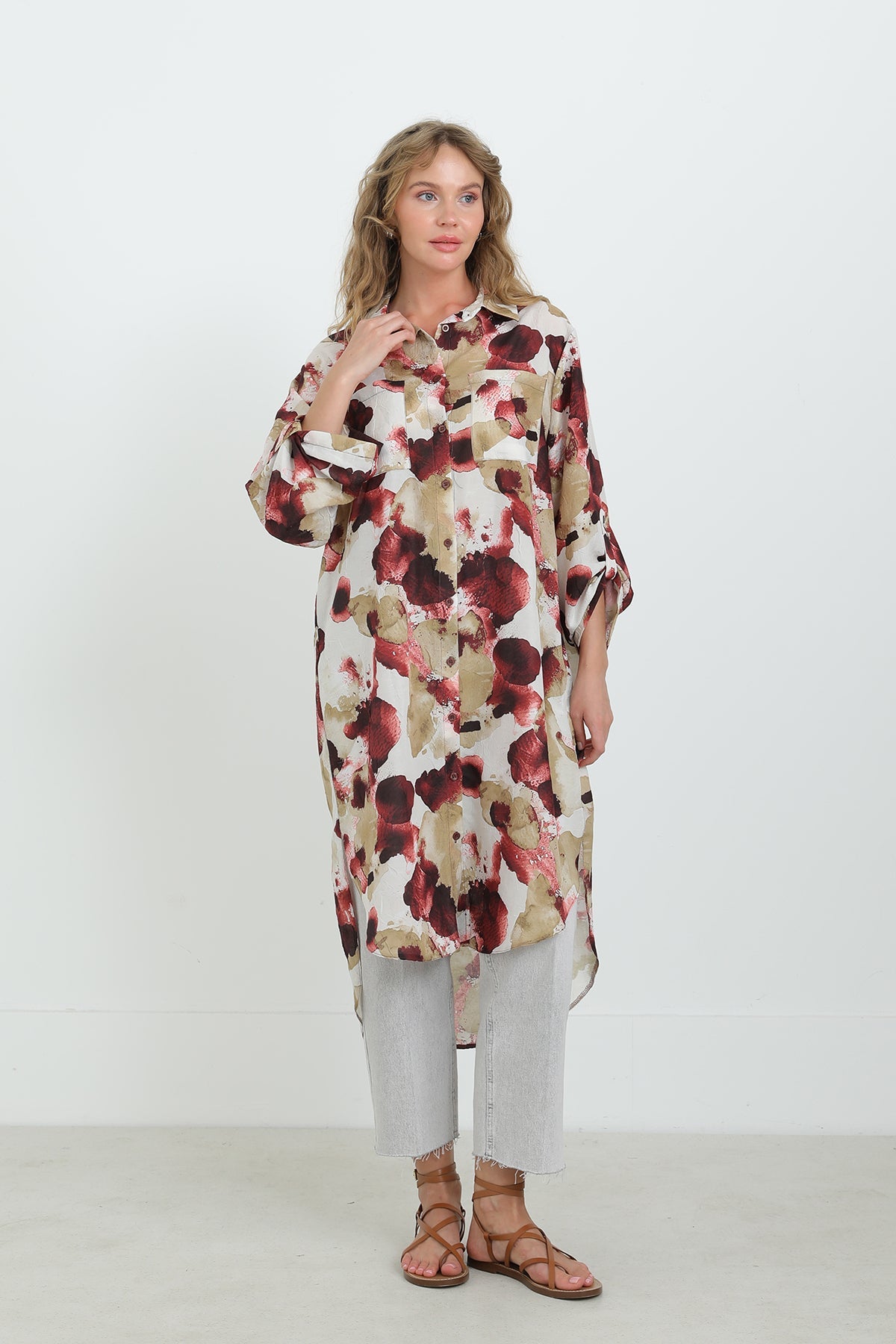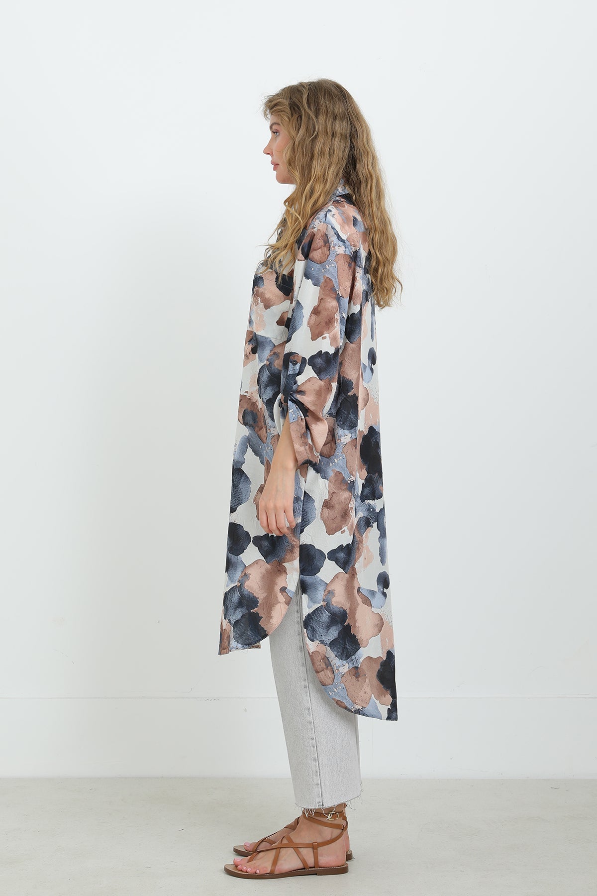 Soyut desenleriyle dikkat çeken bu düğmeli tunik, oversize kesimi sayesinde gün boyu konfor sunar. Hafif ve nefes alabilen kumaşıyla sıcak havalarda vazgeçilmezdir. Gömlek yaka detayı ve yırtmaçlı etek ucu, modern ve zarif bir görünüm sağlar. Pantolonlarla mükemmel uyum yakalar.