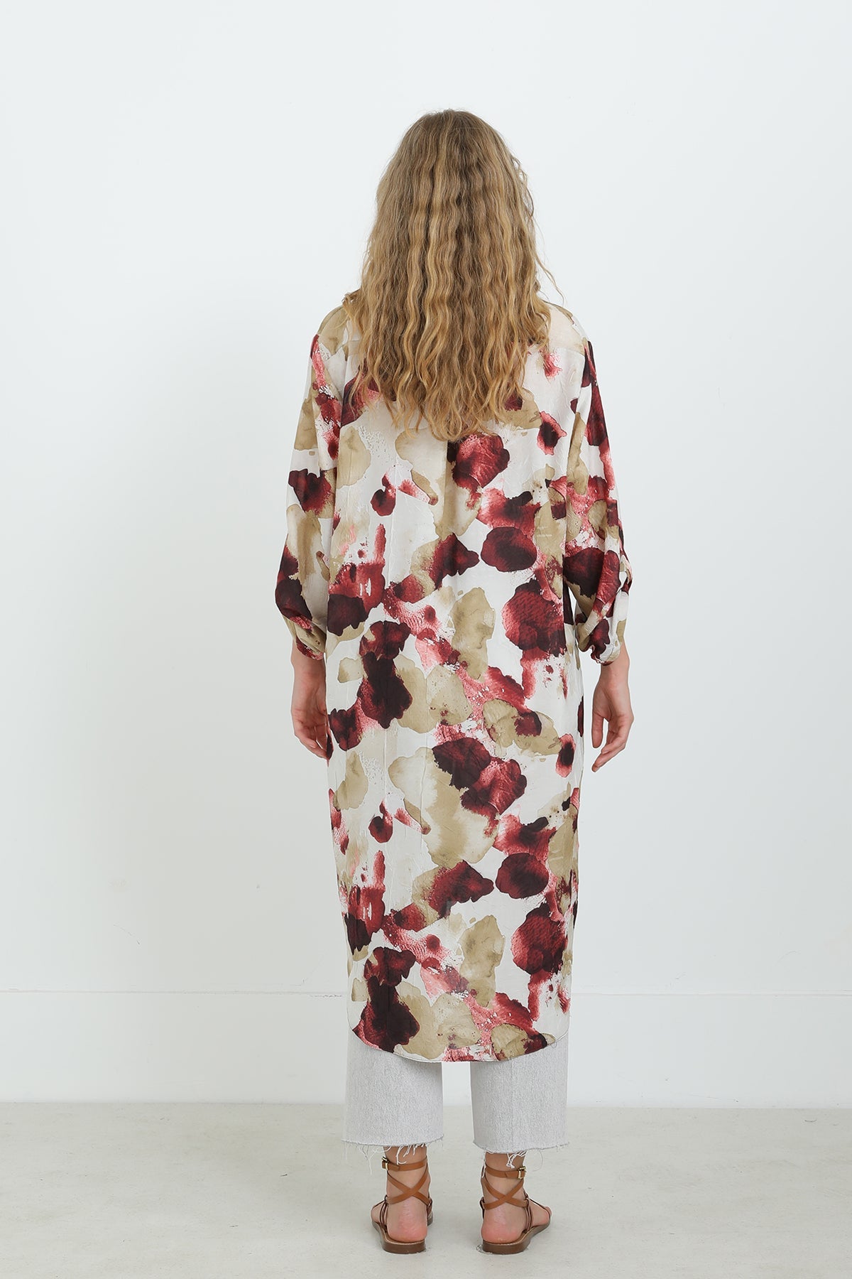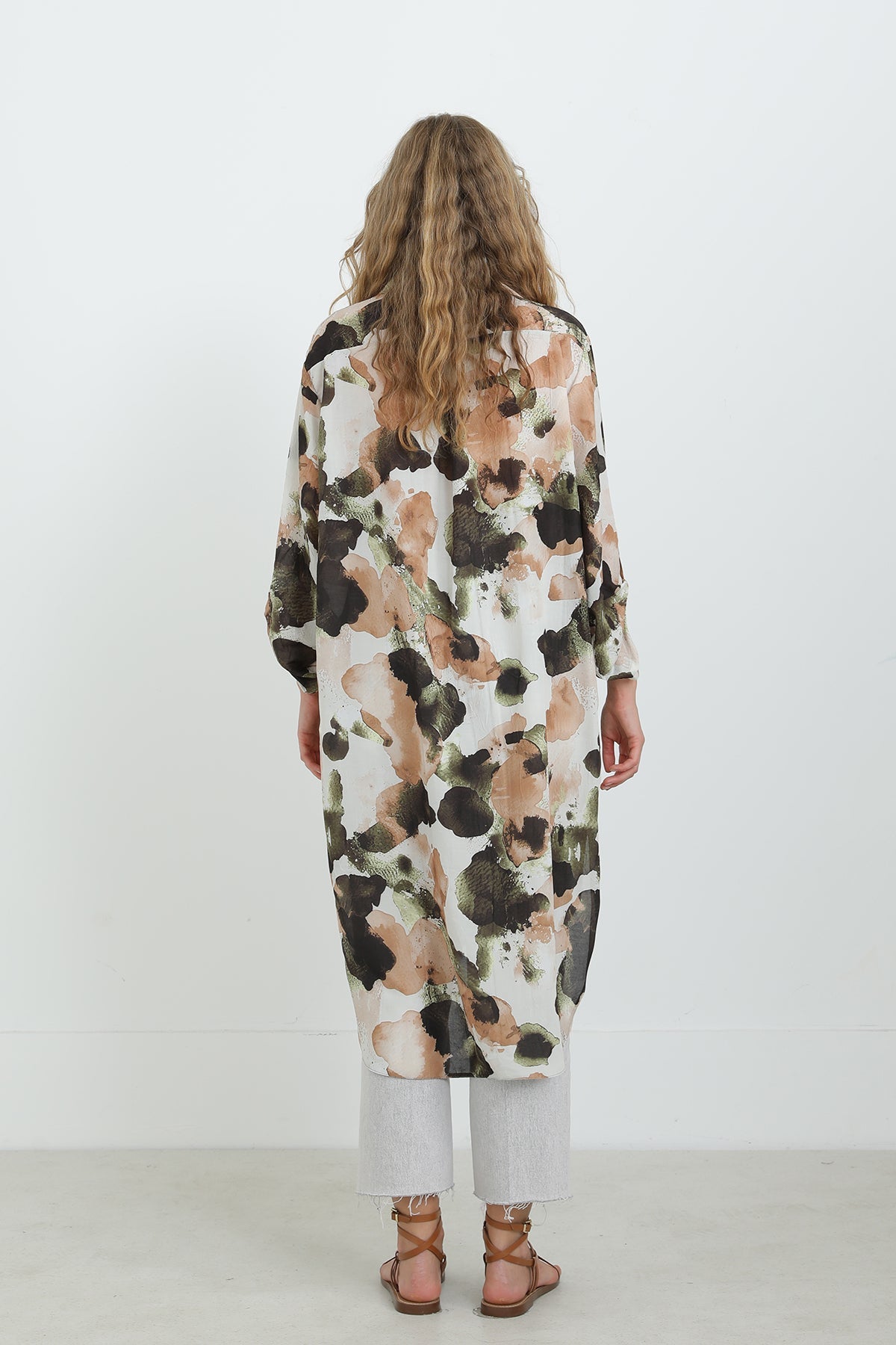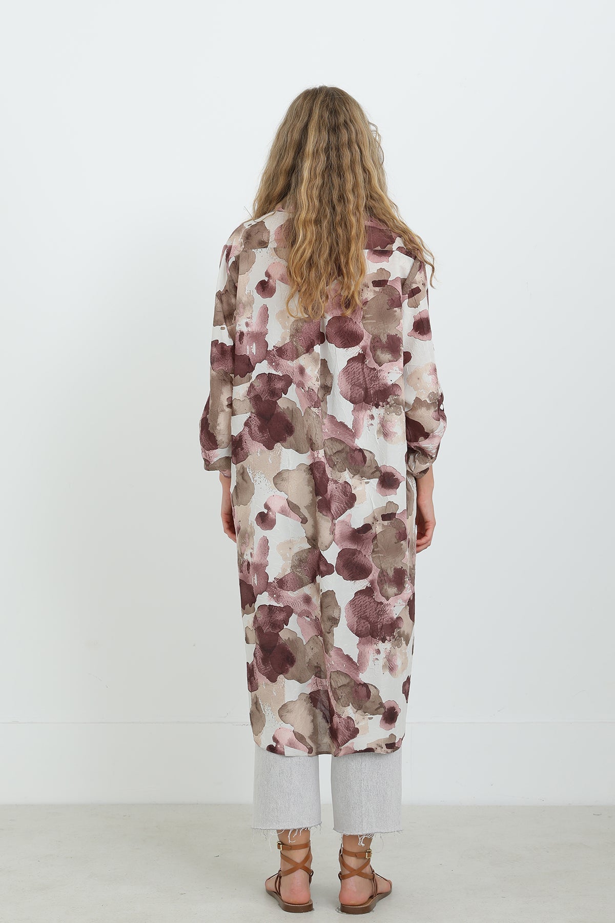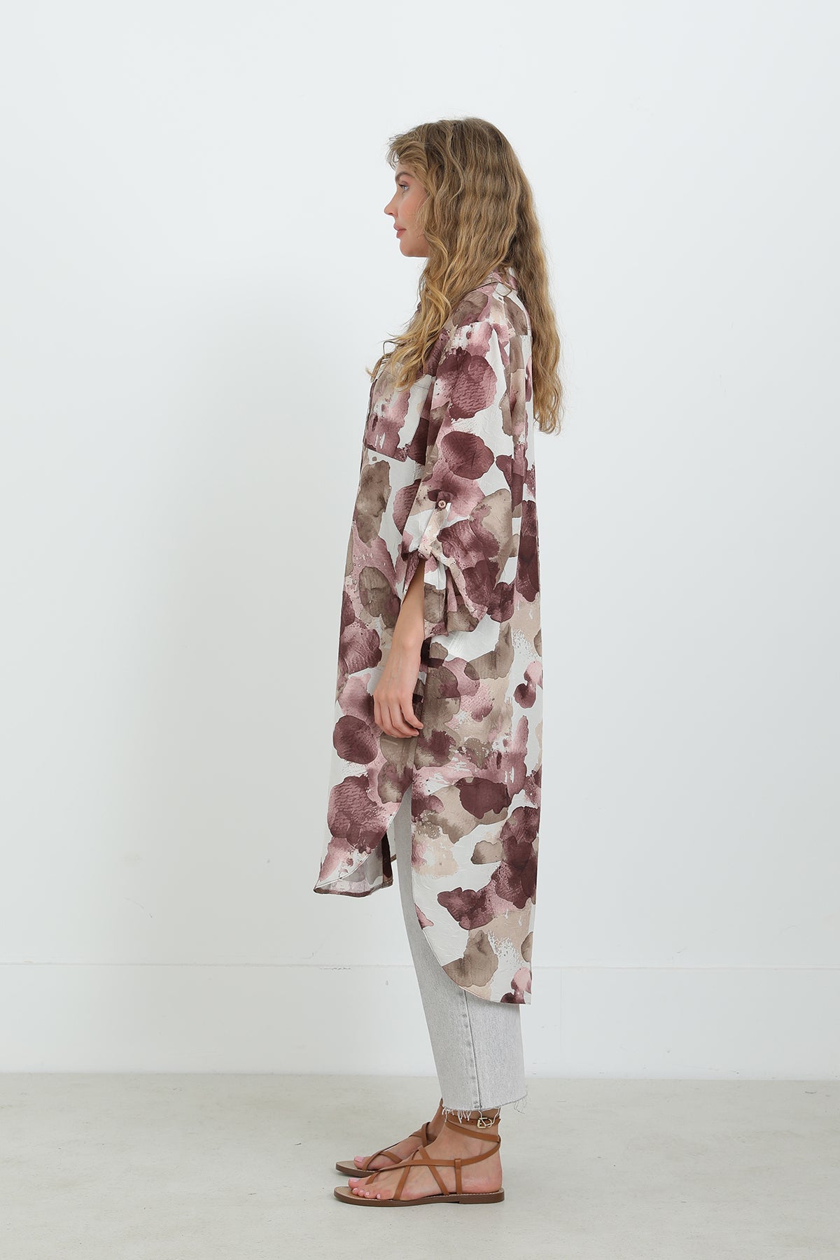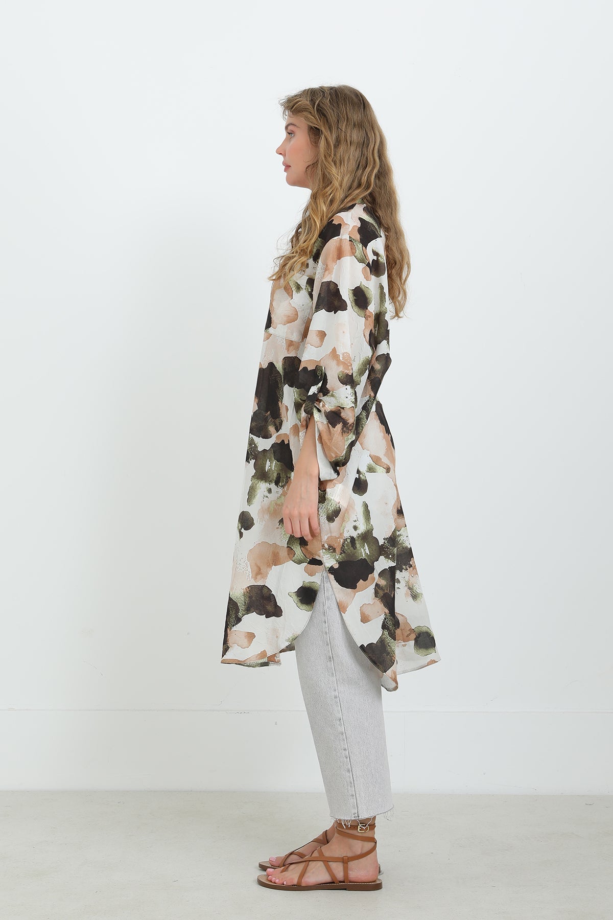 Soyut desenleriyle dikkat çeken bu düğmeli tunik, oversize kesimi sayesinde gün boyu konfor sunar. Hafif ve nefes alabilen kumaşıyla sıcak havalarda vazgeçilmezdir. Gömlek yaka detayı ve yırtmaçlı etek ucu, modern ve zarif bir görünüm sağlar. Pantolonlarla mükemmel uyum yakalar.