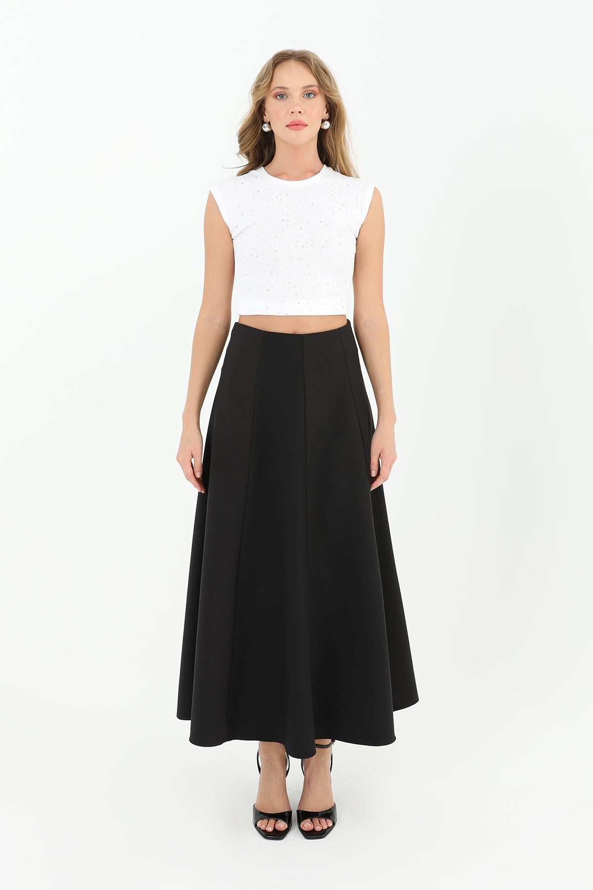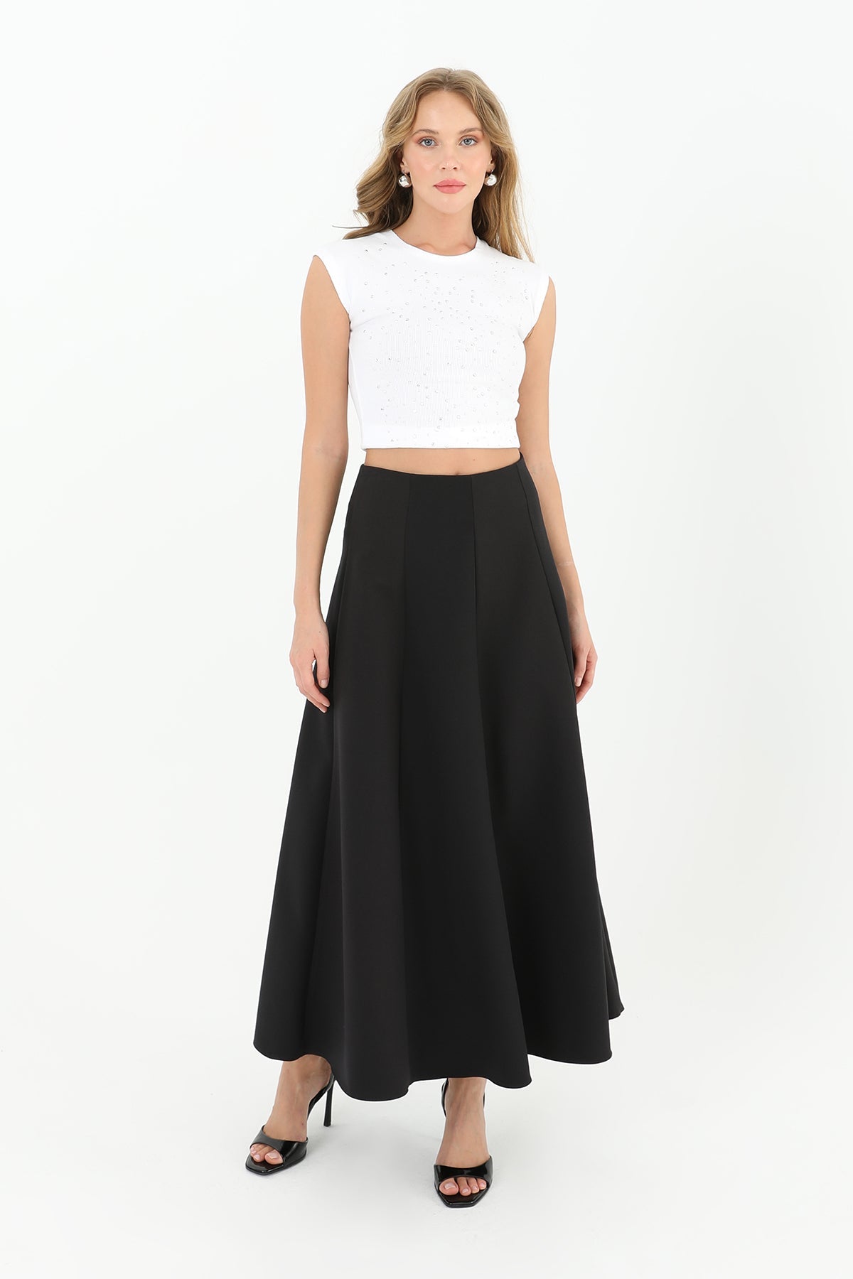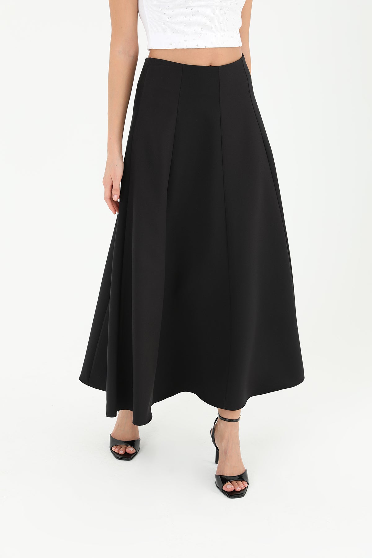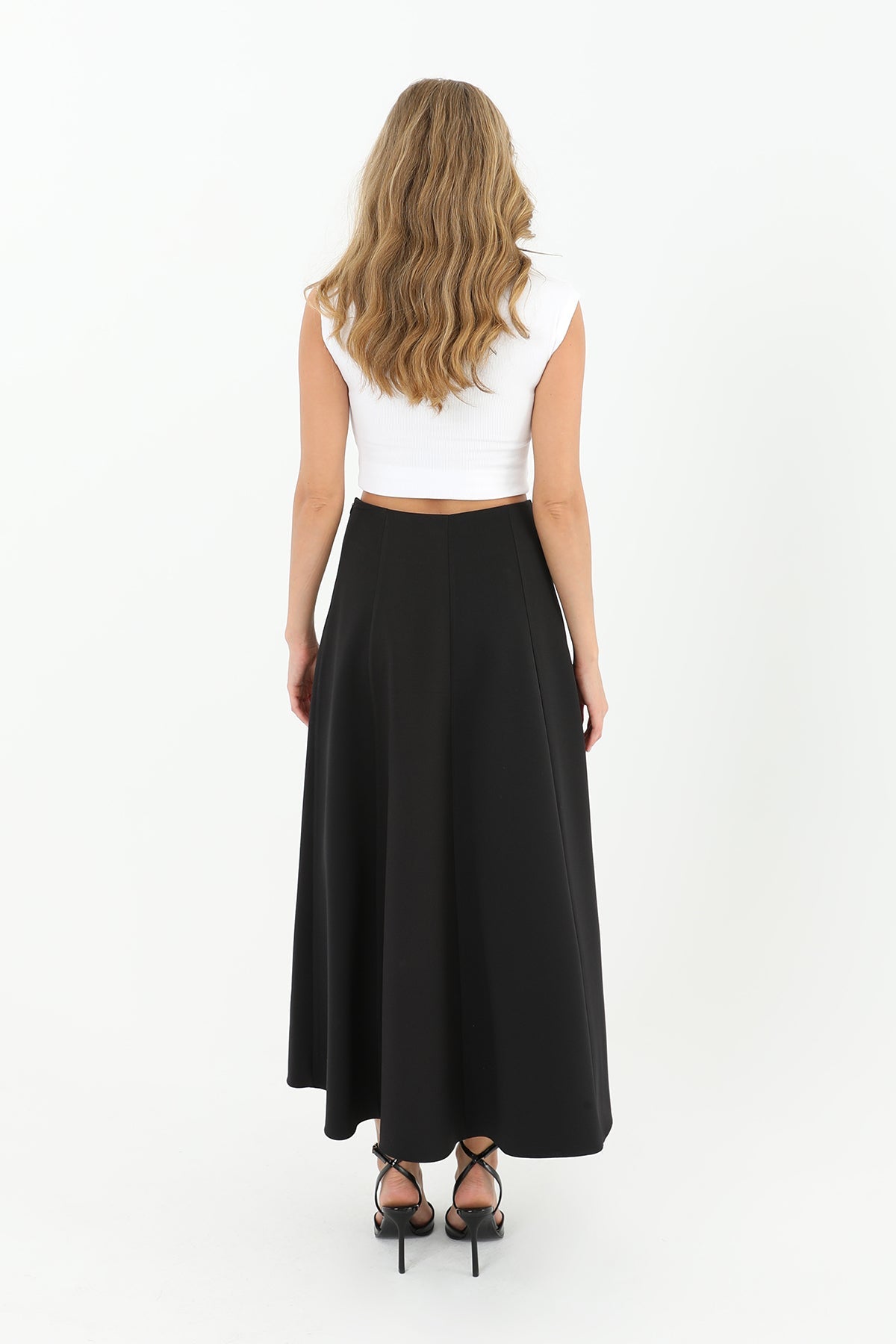 Parçalı yapısı ile dinamik bir görünüm sunan bu kloş etek, her adımda stilinizi öne çıkarır. Zarif ve rahat kesimi ile günlük kombinlerin vazgeçilmezi olacak bu parça, özellikle şık bluzlarla veya crop toplarla tamamlandığında dikkat çeker.