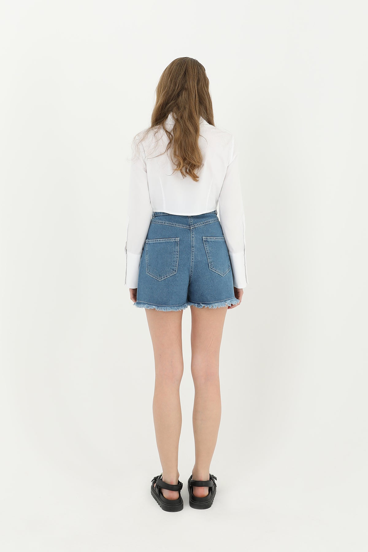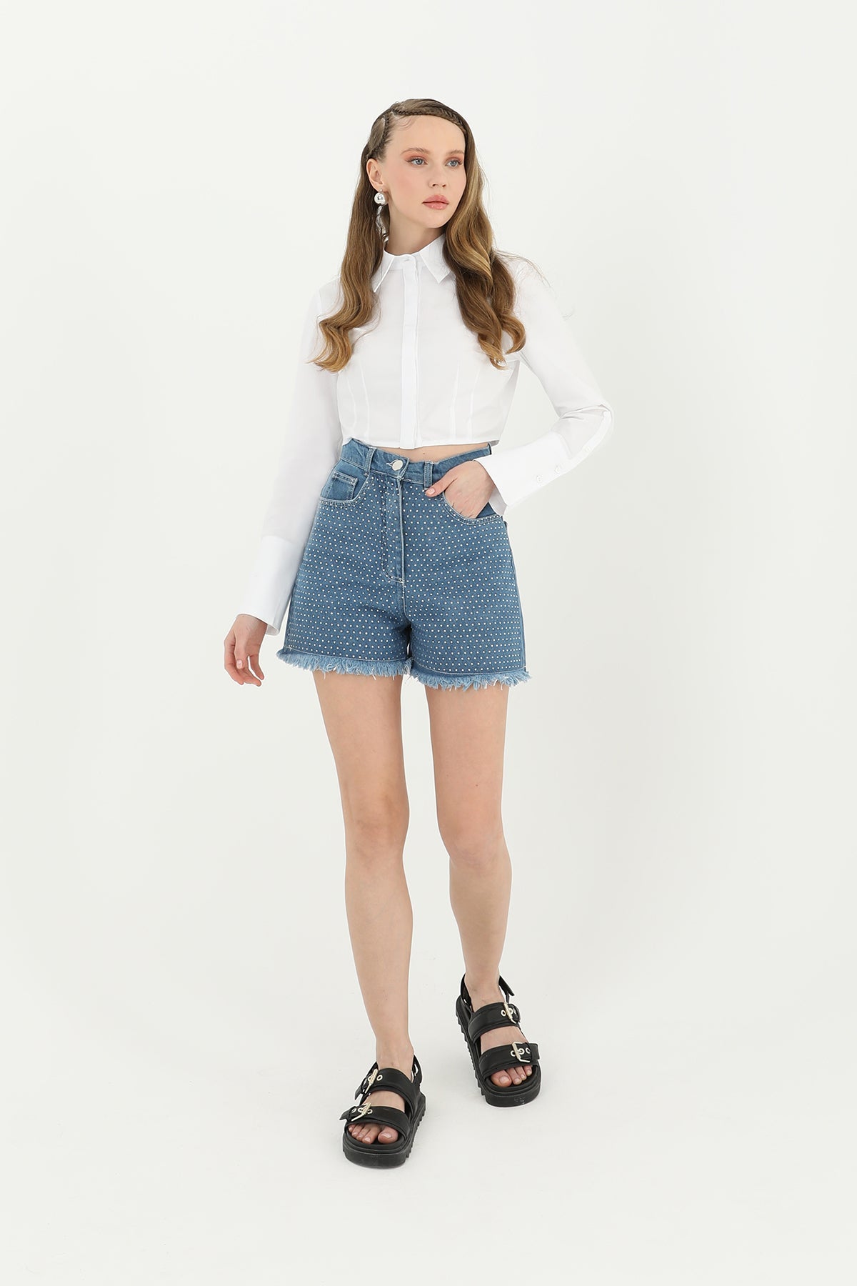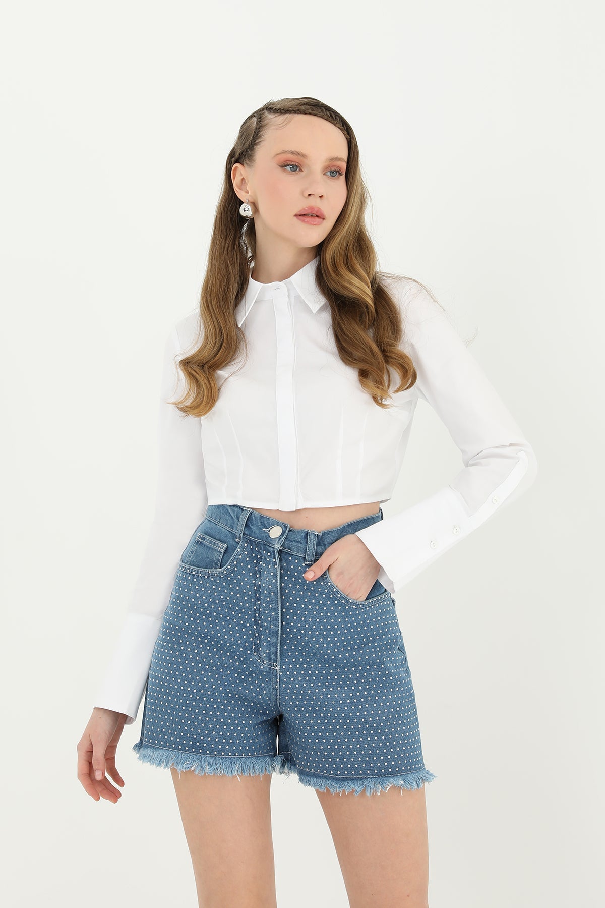 • Kadın Manşet Kol Detaylı Crop Gömlek - 31669GML