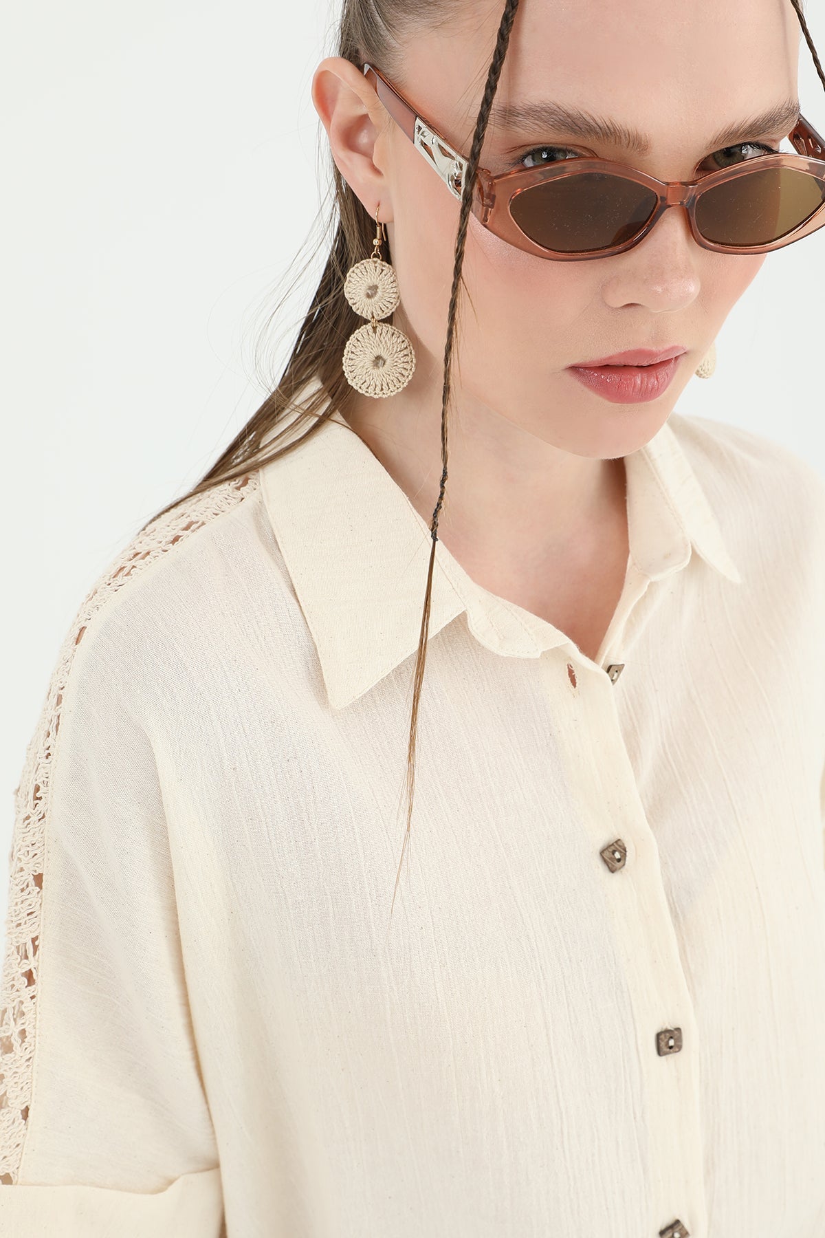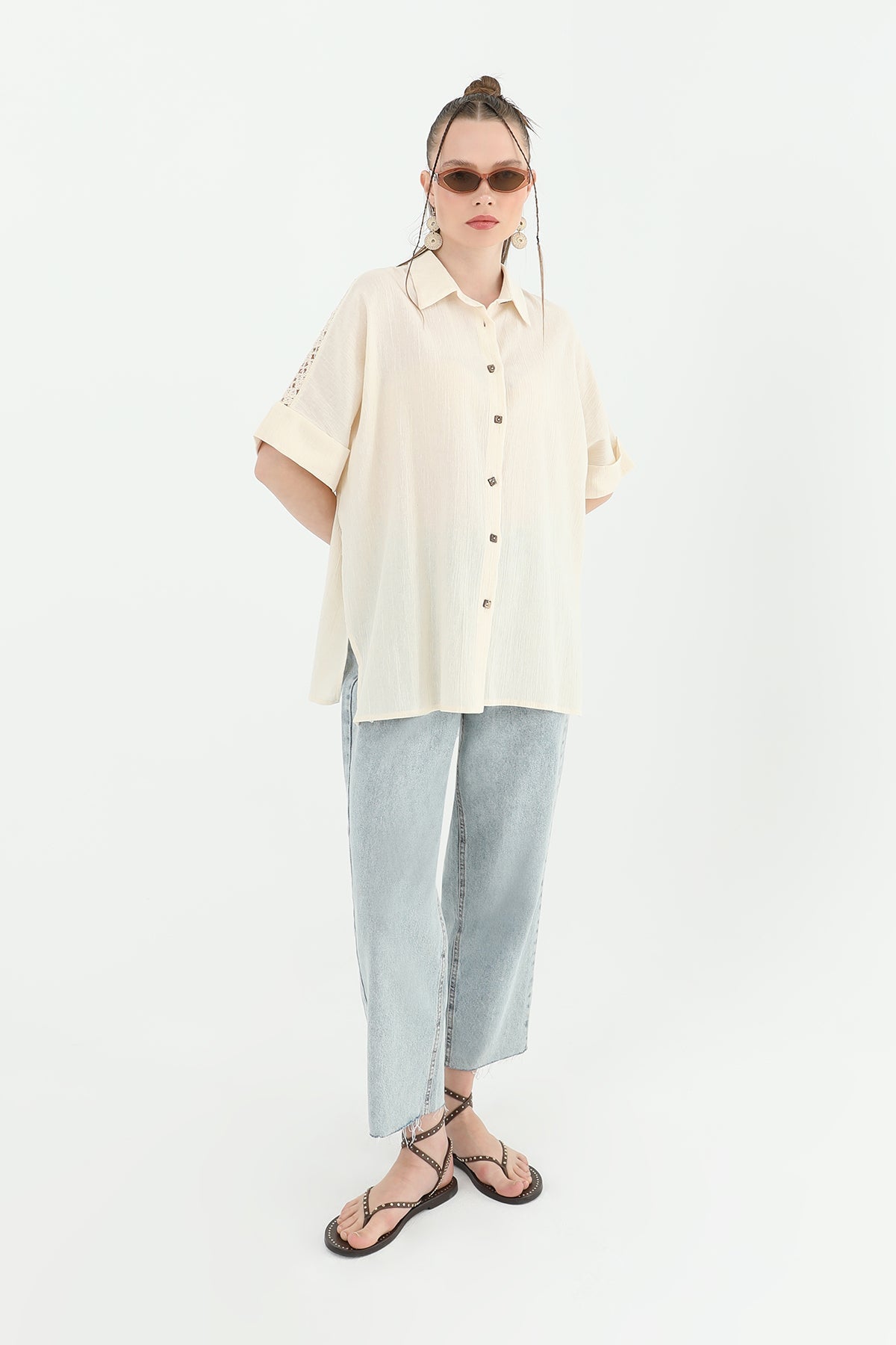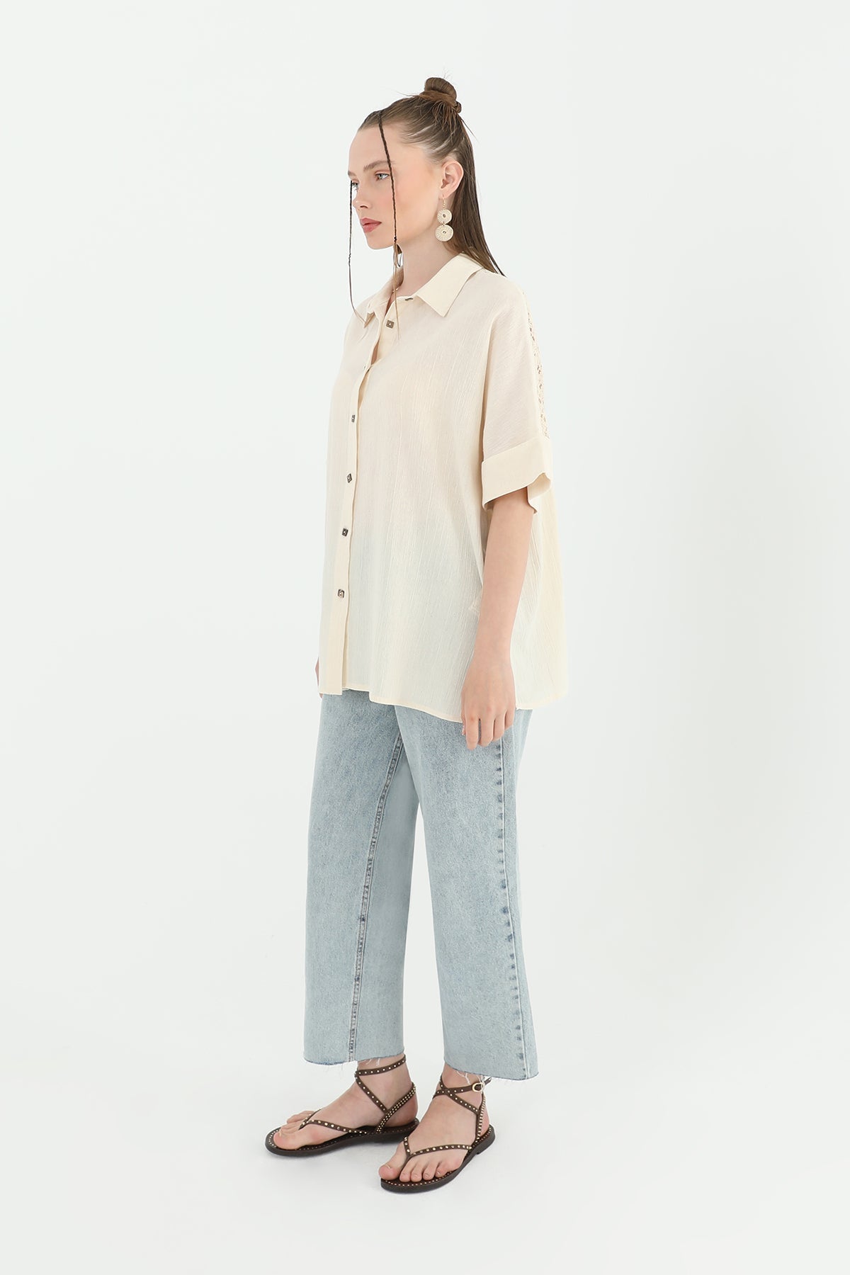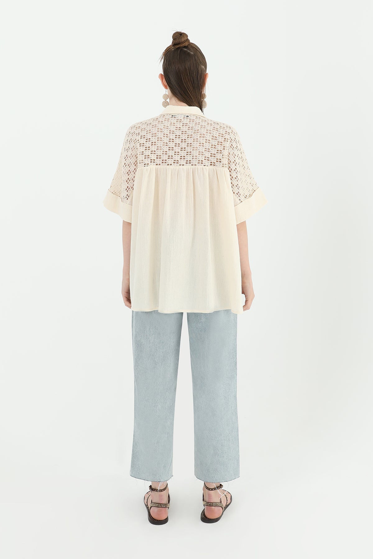 Arka roba dantel detayıyla hareketlenen bu kısa kollu gömlek, feminen bir görünüm sunuyor. Rahat kesimiyle günlük kullanıma uygun.