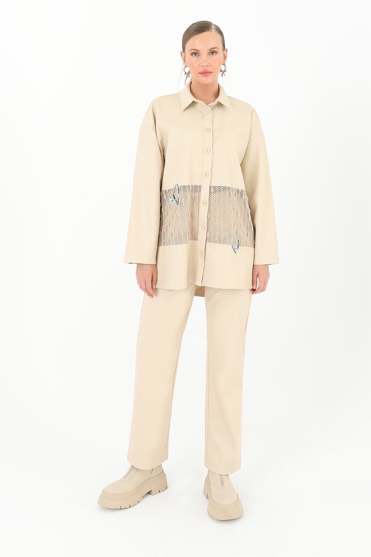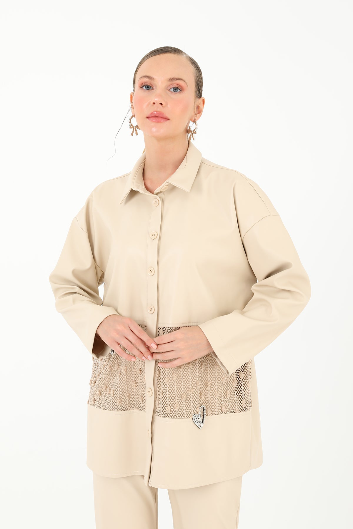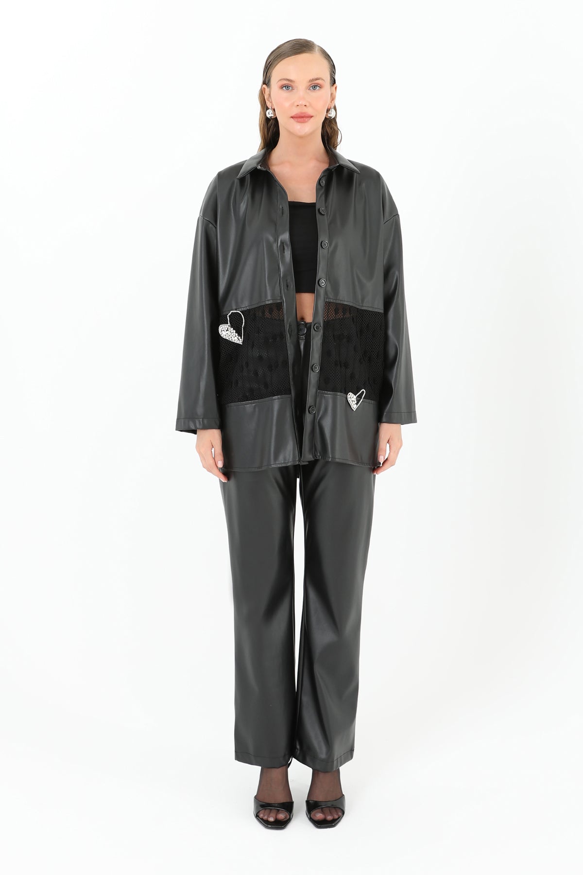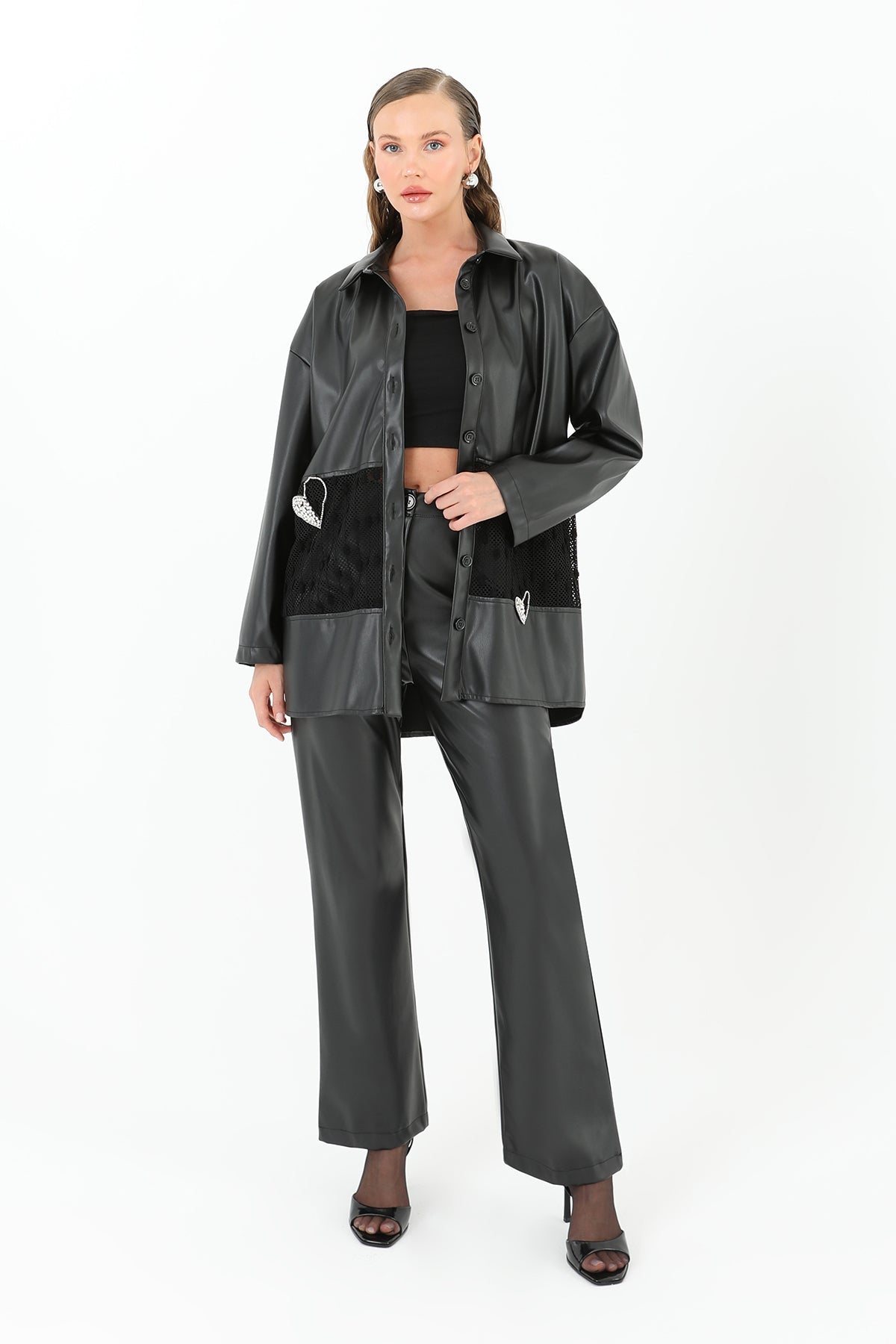 Kadın File Detaylı Deri Gömlek, şık file detayları ve modern deri tasarımıyla dikkat çeker. Rahat kesimi ve kaliteli kumaşı, hem günlük hem de özel etkinliklerde konfor sağlar. File detayları, gömleğe dinamik bir hava katar. Farklı renk seçenekleriyle stilinize uyum sağlar ve kombinlerinizi tamamlar.