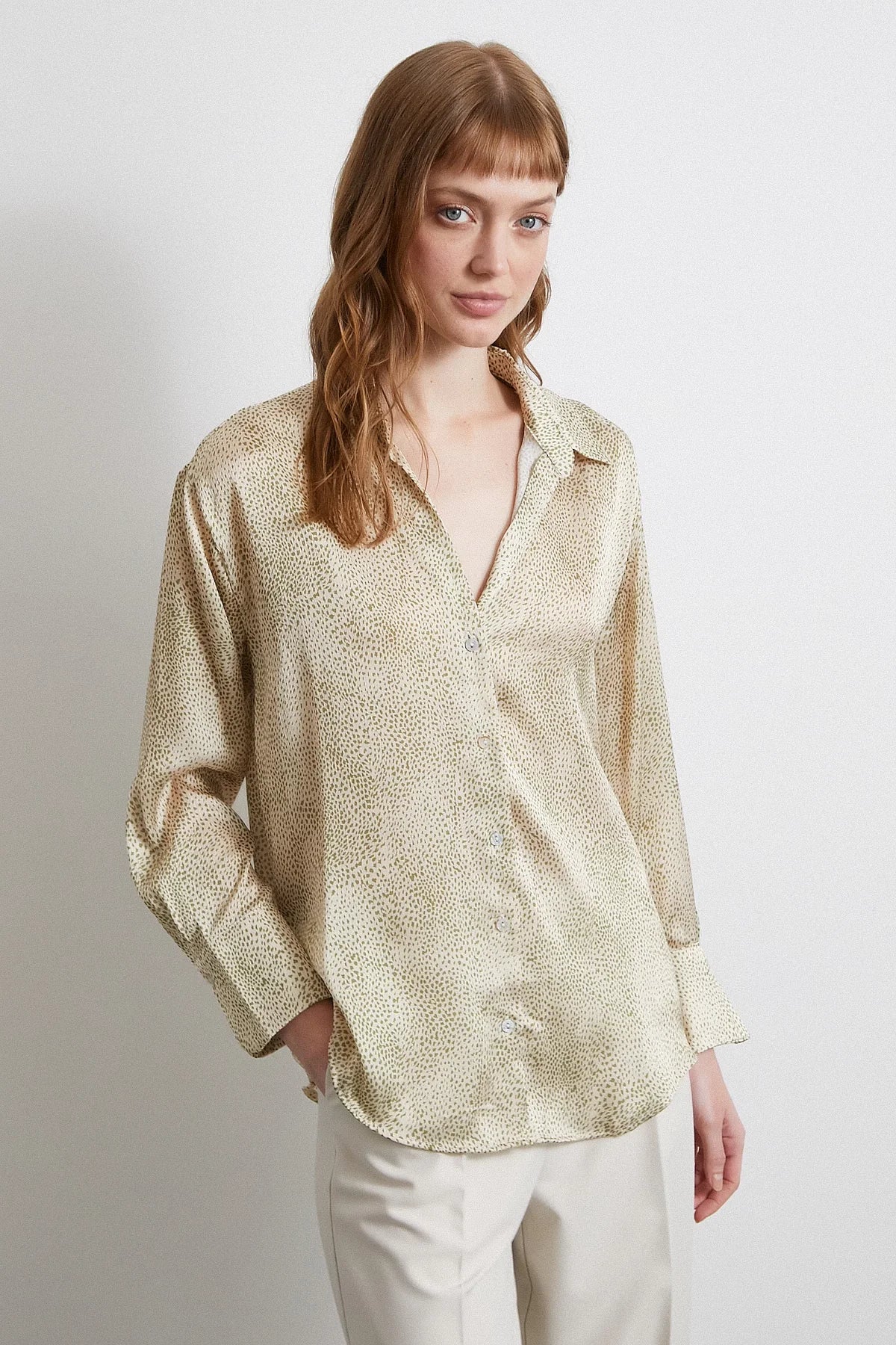 V Yaka Desenli Saten Gömlek - Yeşil