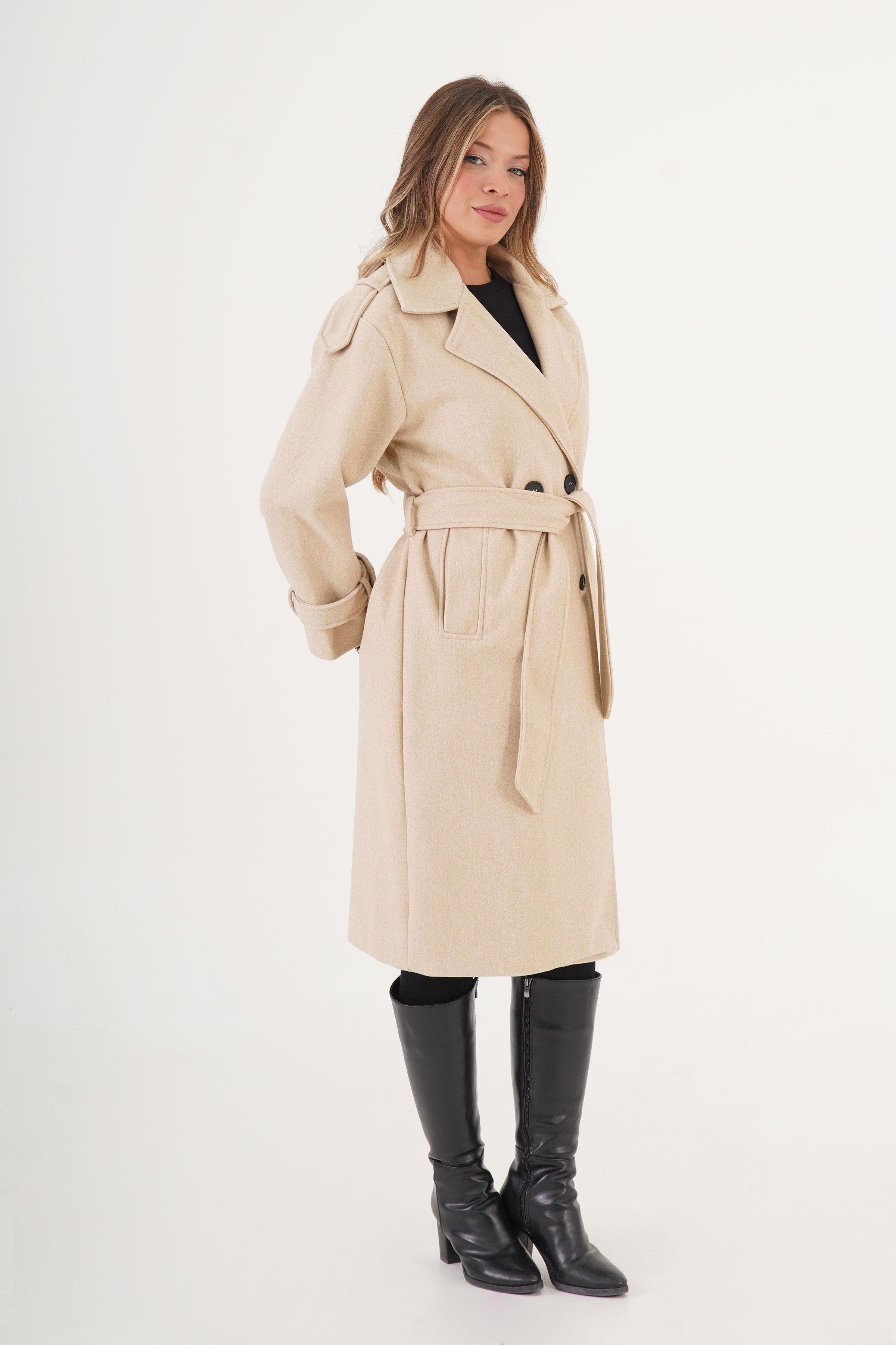Ürün ÖlçüleriBoy110 cmGöğüs106 cmBel98 cmKumaş %100 Polyester Manken Ölçüleri Boy : 1.75 cm Lustrin 2025-2026 toptan koleksiyonunun zarif ve sofistike parçalarından biri: Apolet detaylı kuşaklı kaşe kaban. Kuşak detayıyla bel hattını vurgulayan bu kaban, apolet detaylarıyla modern ve şık bir görünüm sunar. Kaliteli kaşe kumaşıyla sıcak tutarken, klasik kesimi her vücut tipine uyum sağlar. Günlük kullanımda veya özel davetlerde tercih edilebilecek bu model, mağazaların kış koleksiyonlarında öne çıkan bir parça.