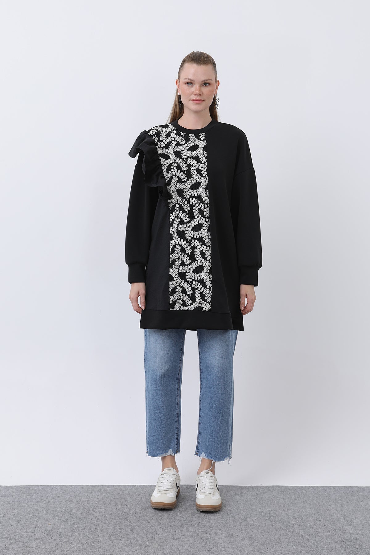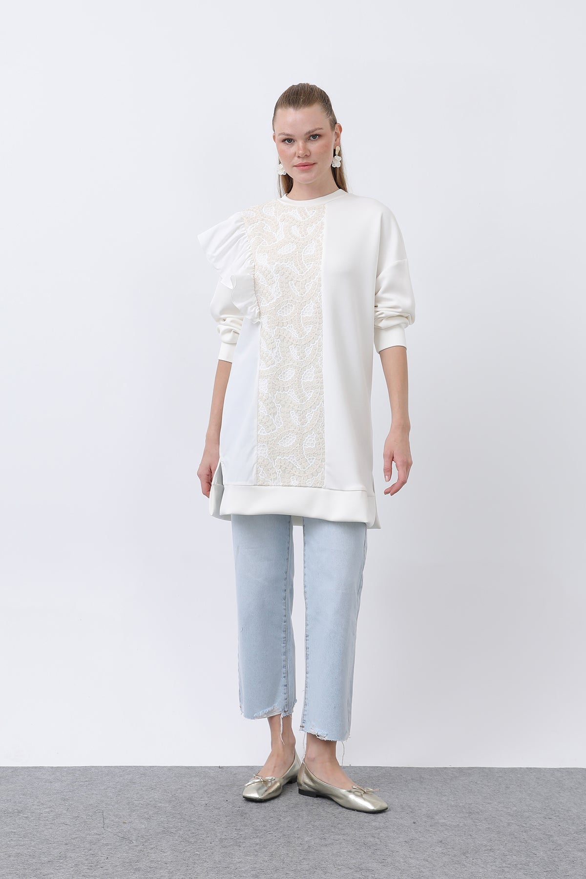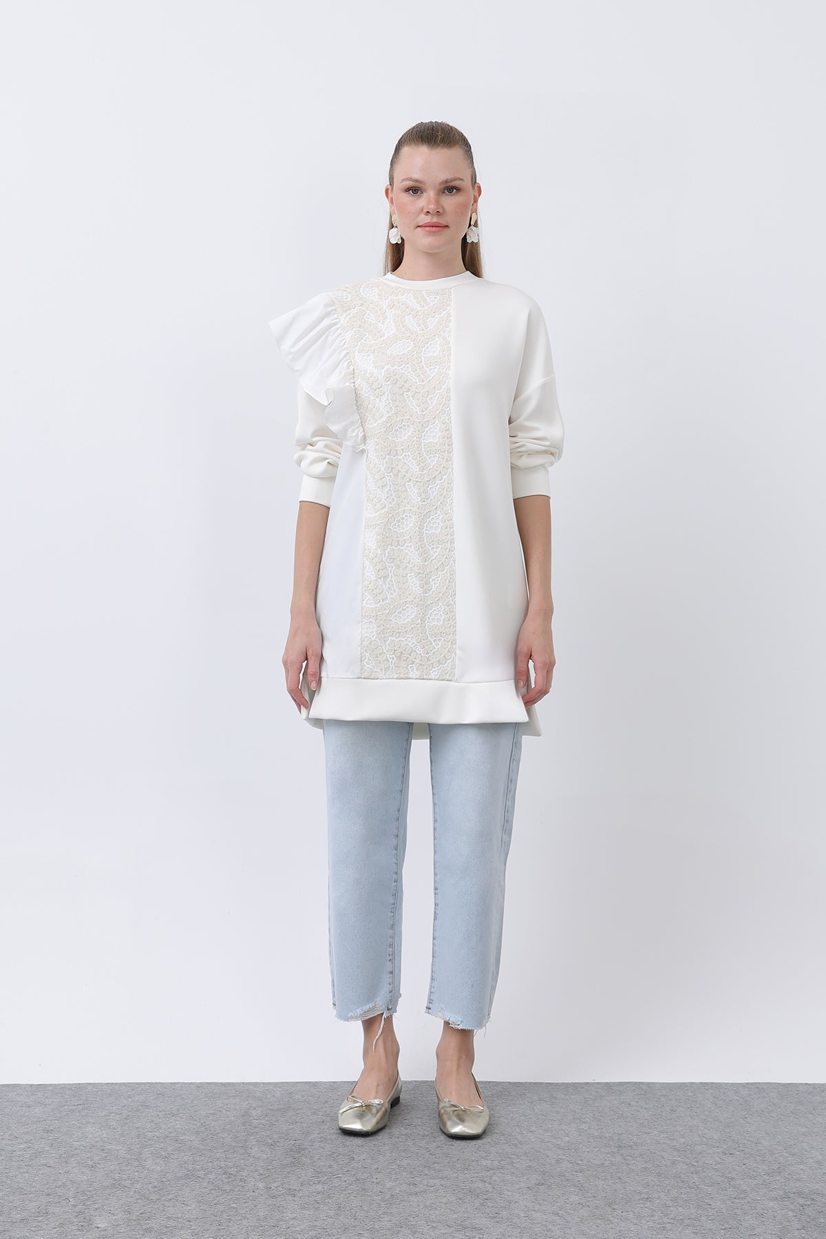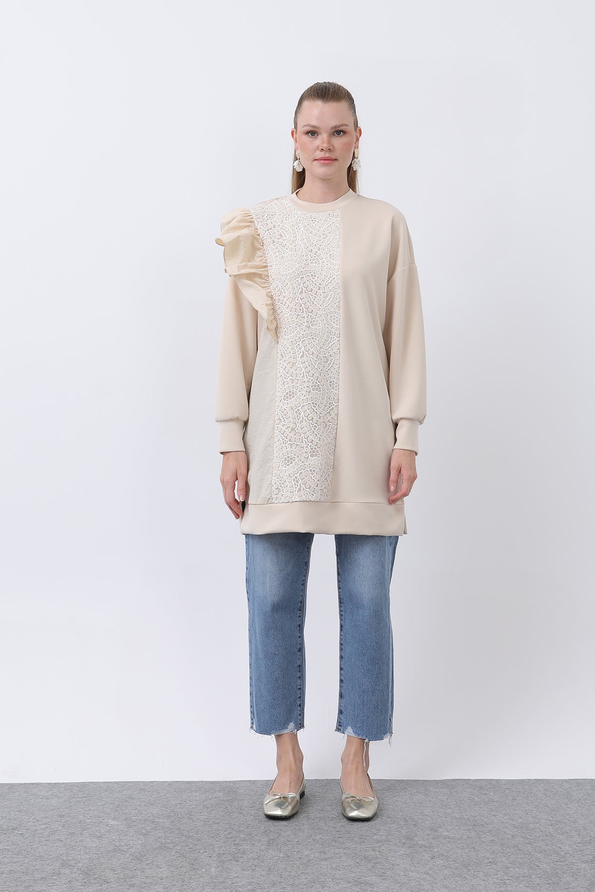 Romantik detayları sevenler için tasarlanan bu tunik, omuzdaki fırfır ve dantel garnili tasarımıyla feminen bir hava katıyor. İnce dokusu ve zarif görünümüyle kombinlerinize elegan bir dokunuş sağlayacak.
