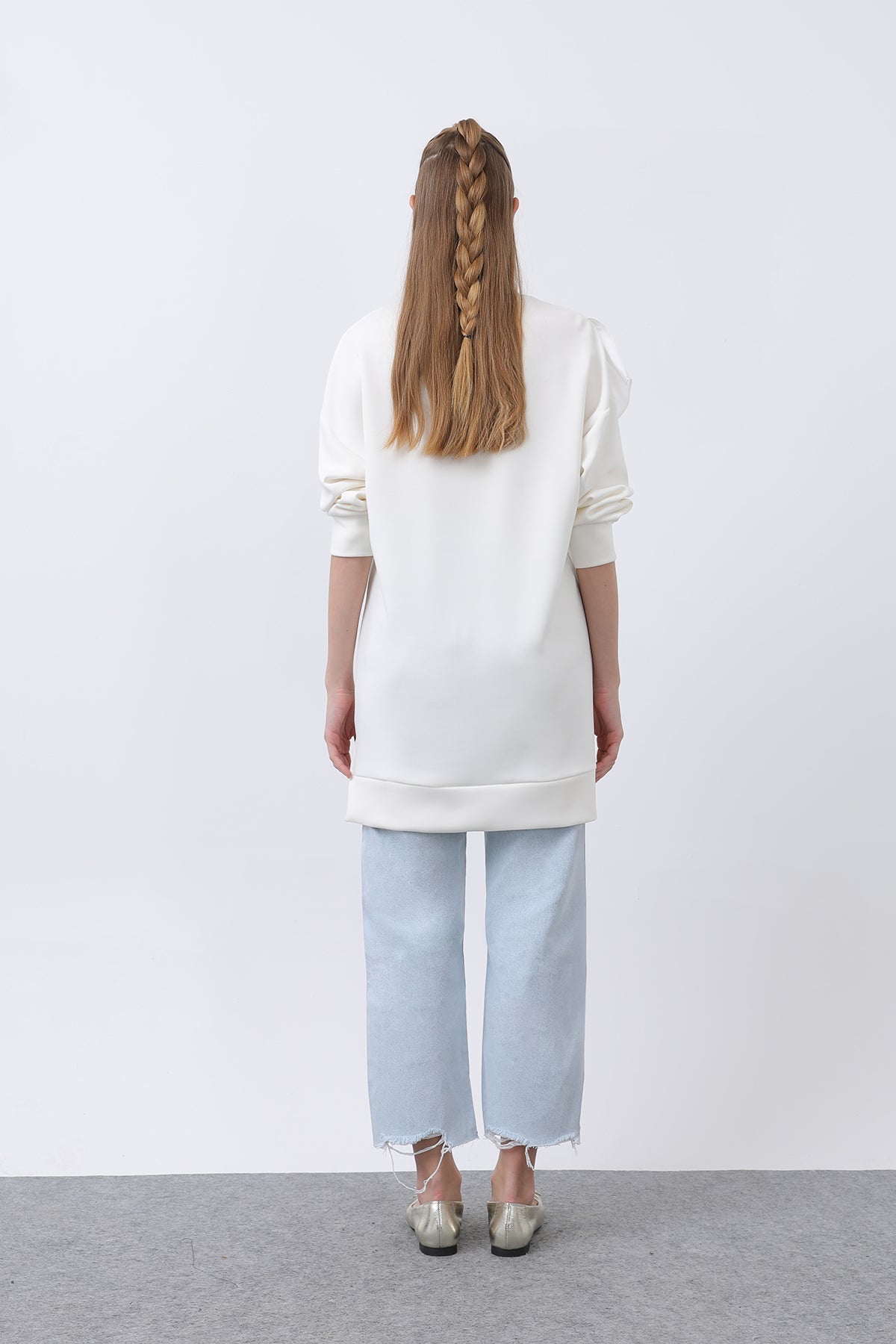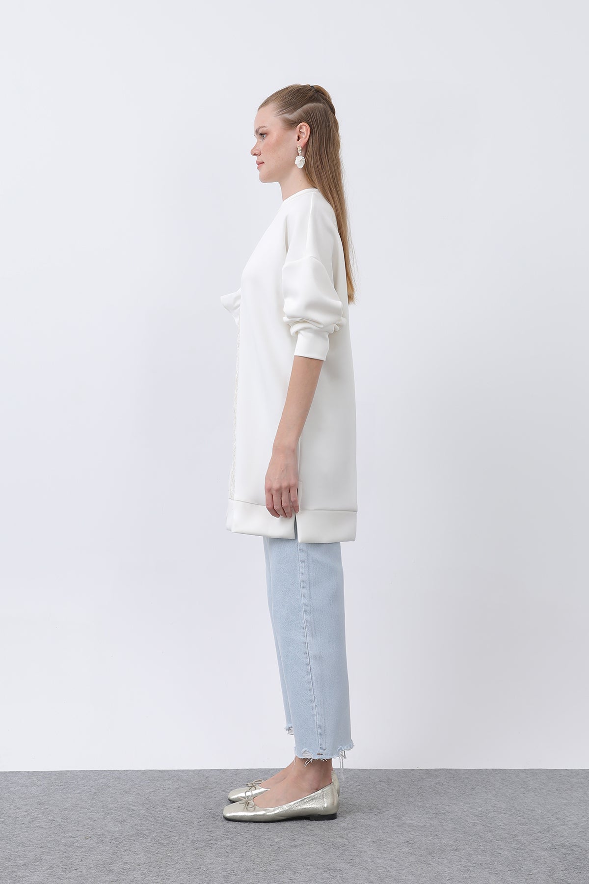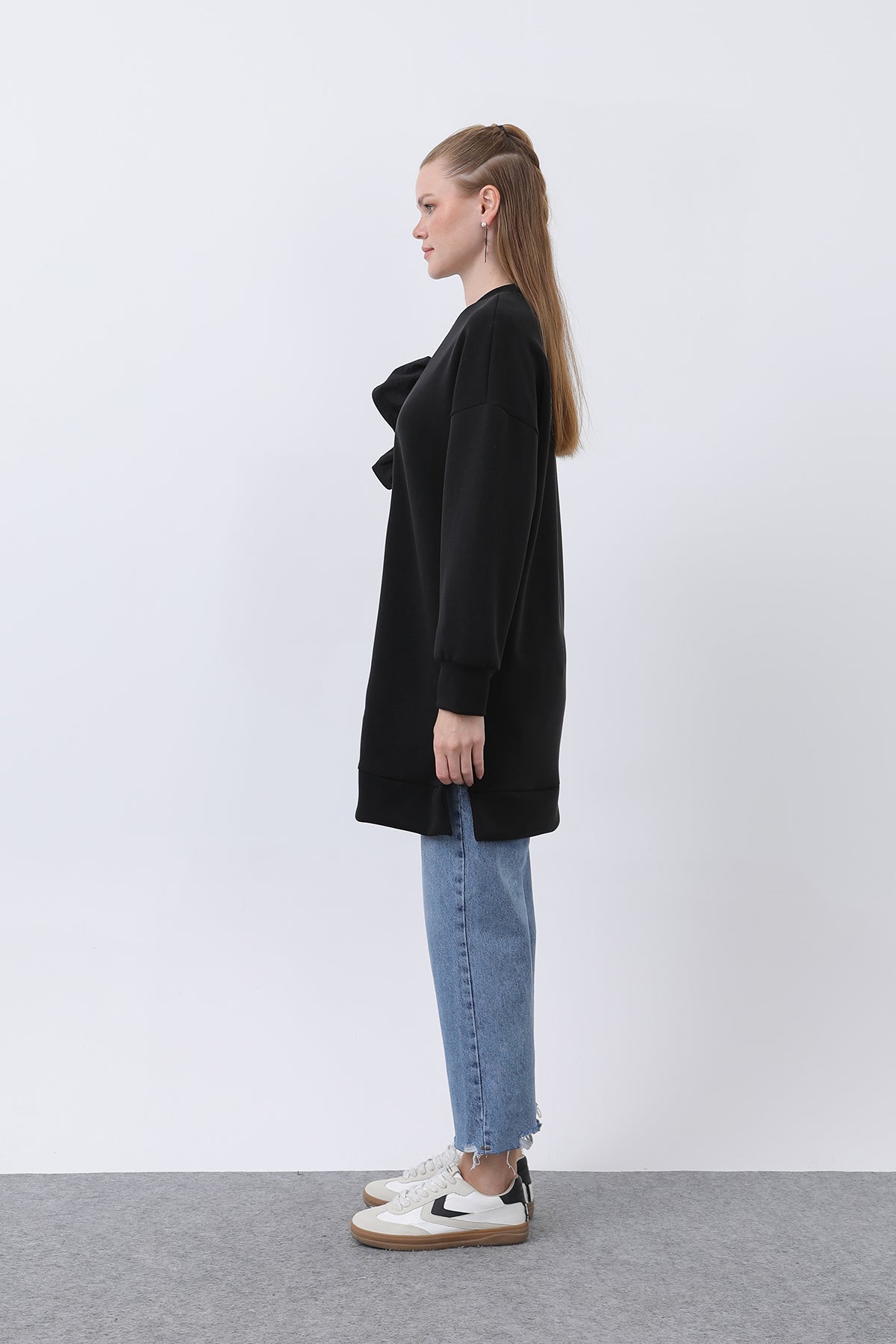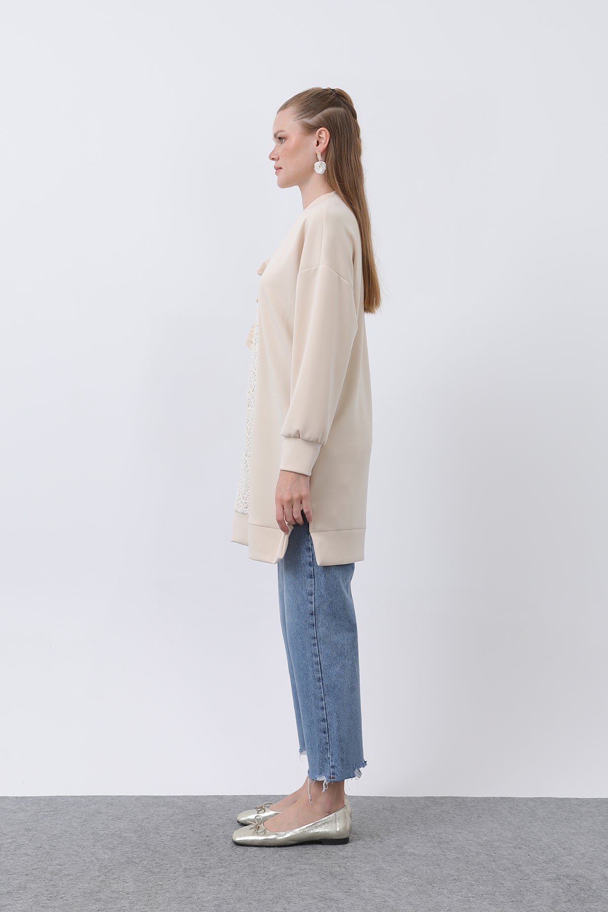 Romantik detayları sevenler için tasarlanan bu tunik, omuzdaki fırfır ve dantel garnili tasarımıyla feminen bir hava katıyor. İnce dokusu ve zarif görünümüyle kombinlerinize elegan bir dokunuş sağlayacak.