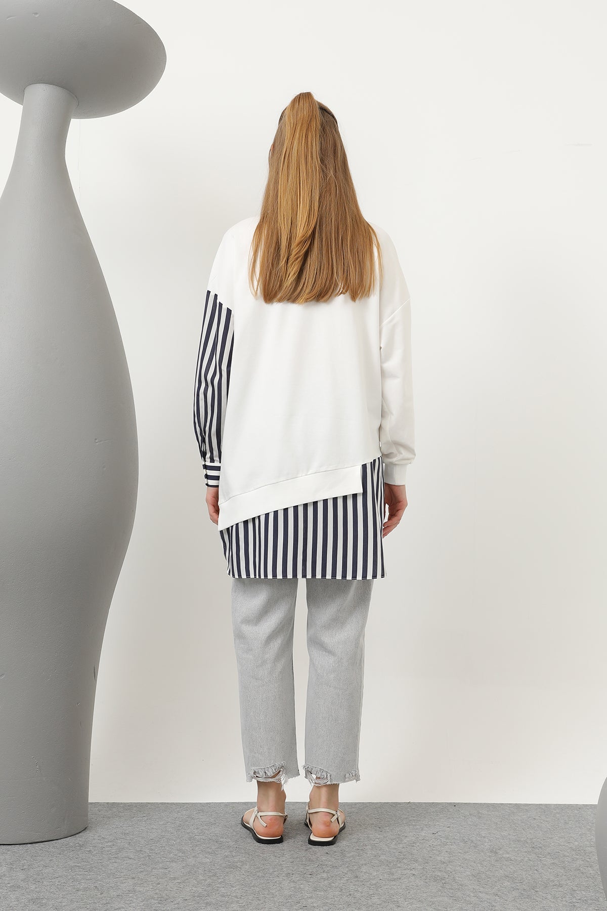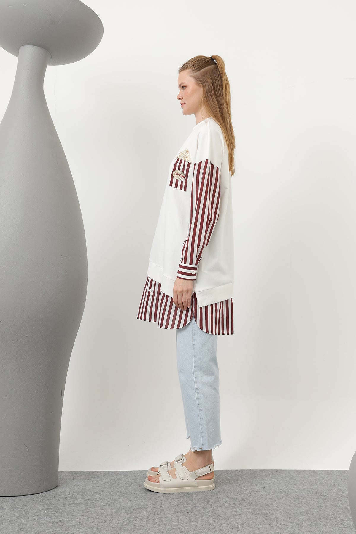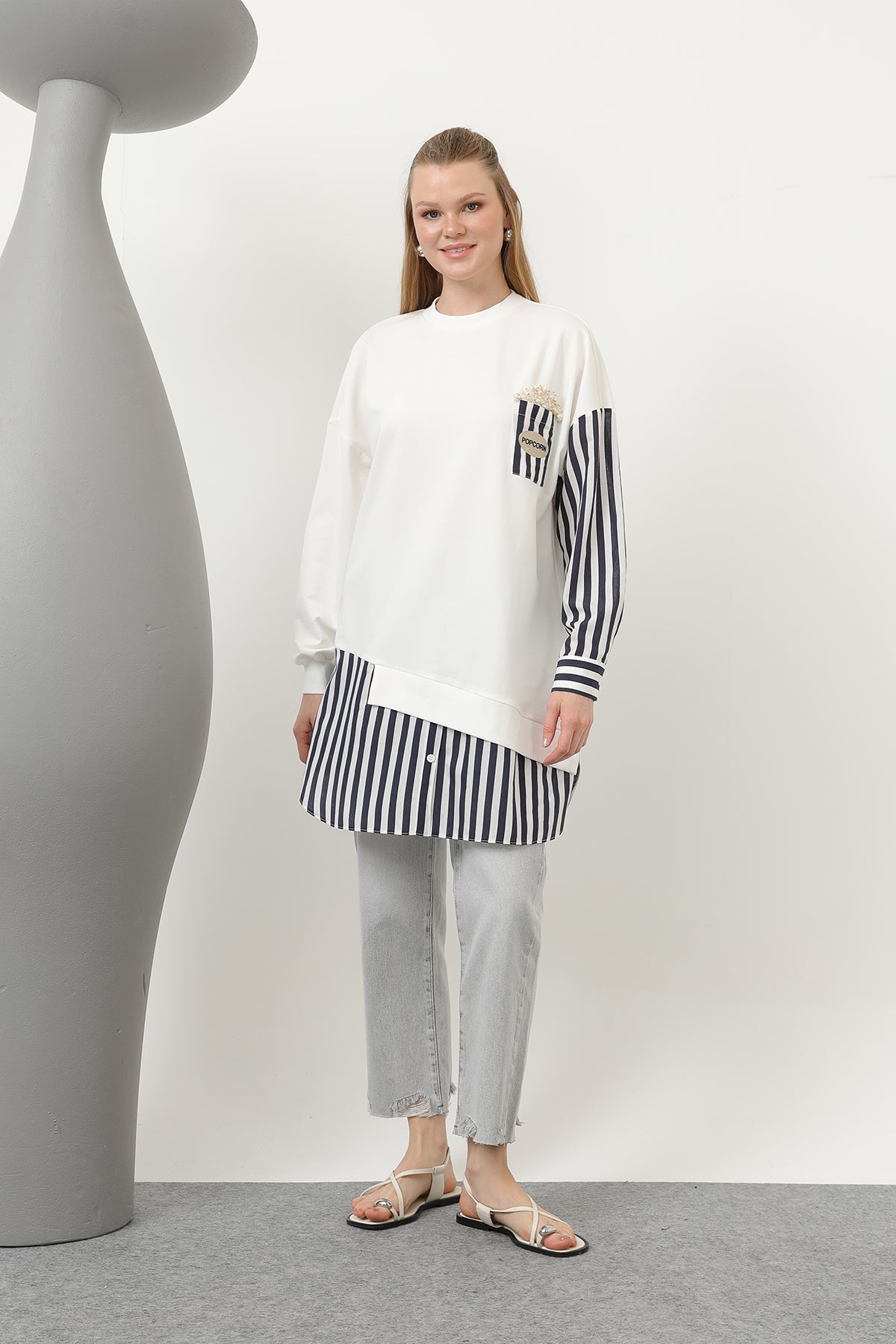 Pop corn baskısı ve boncuk işlemeleriyle dikkat çeken bu tunik, modern tasarımıyla zarif bir hava yaratır. Çizgi garnili detaylarıyla şıklığınızı ön plana çıkaran bu tunik, günlük stilinize uyum sağlar.