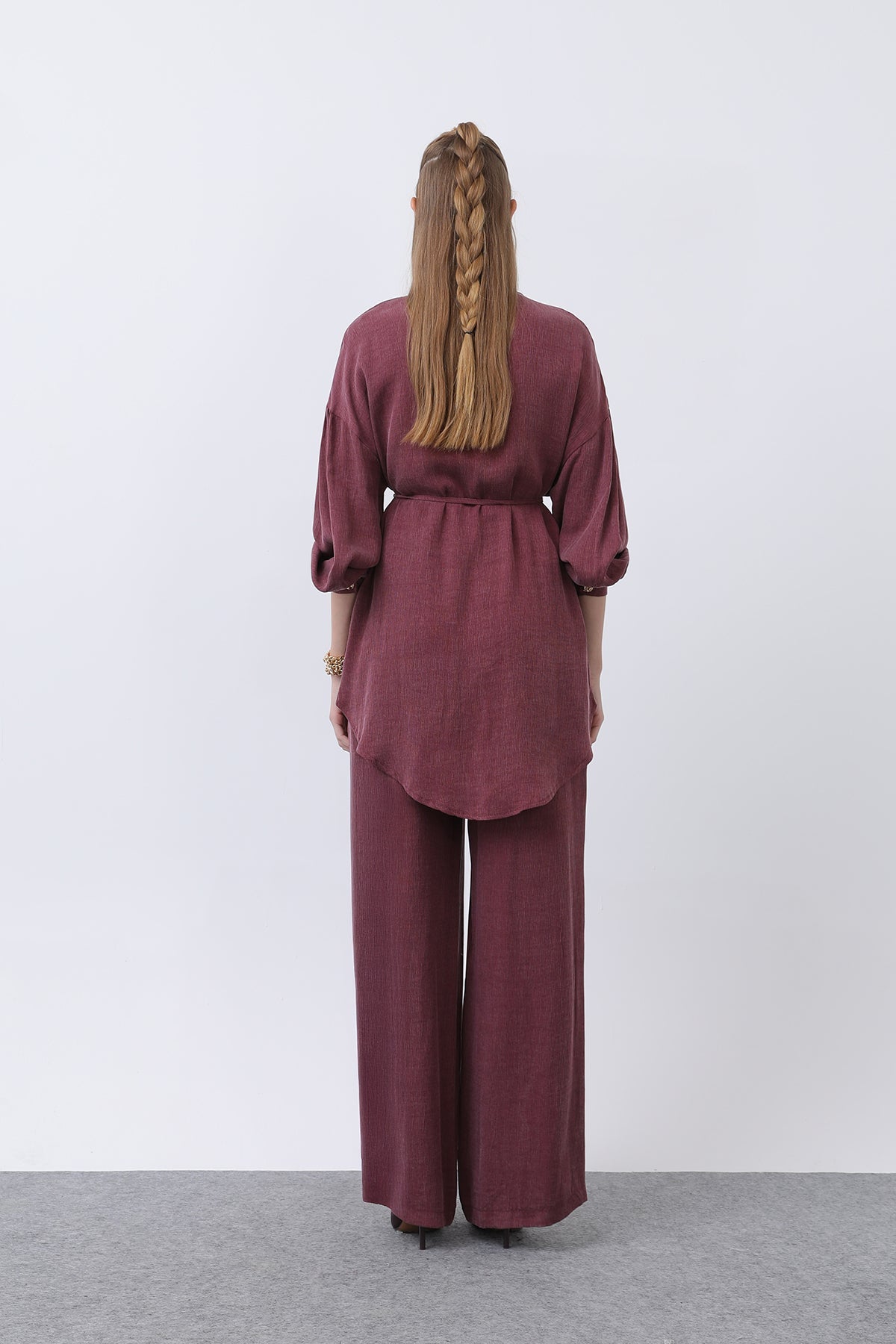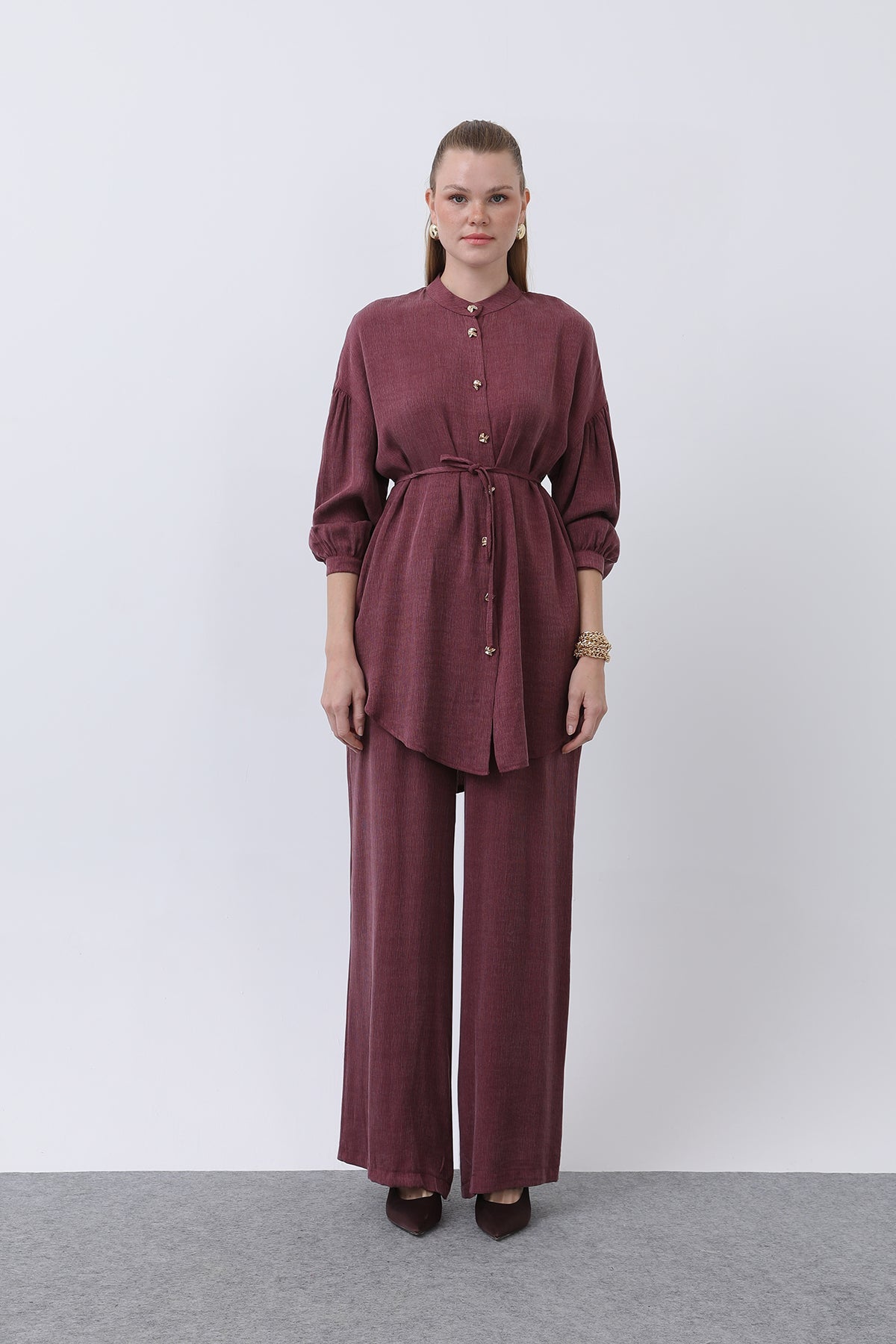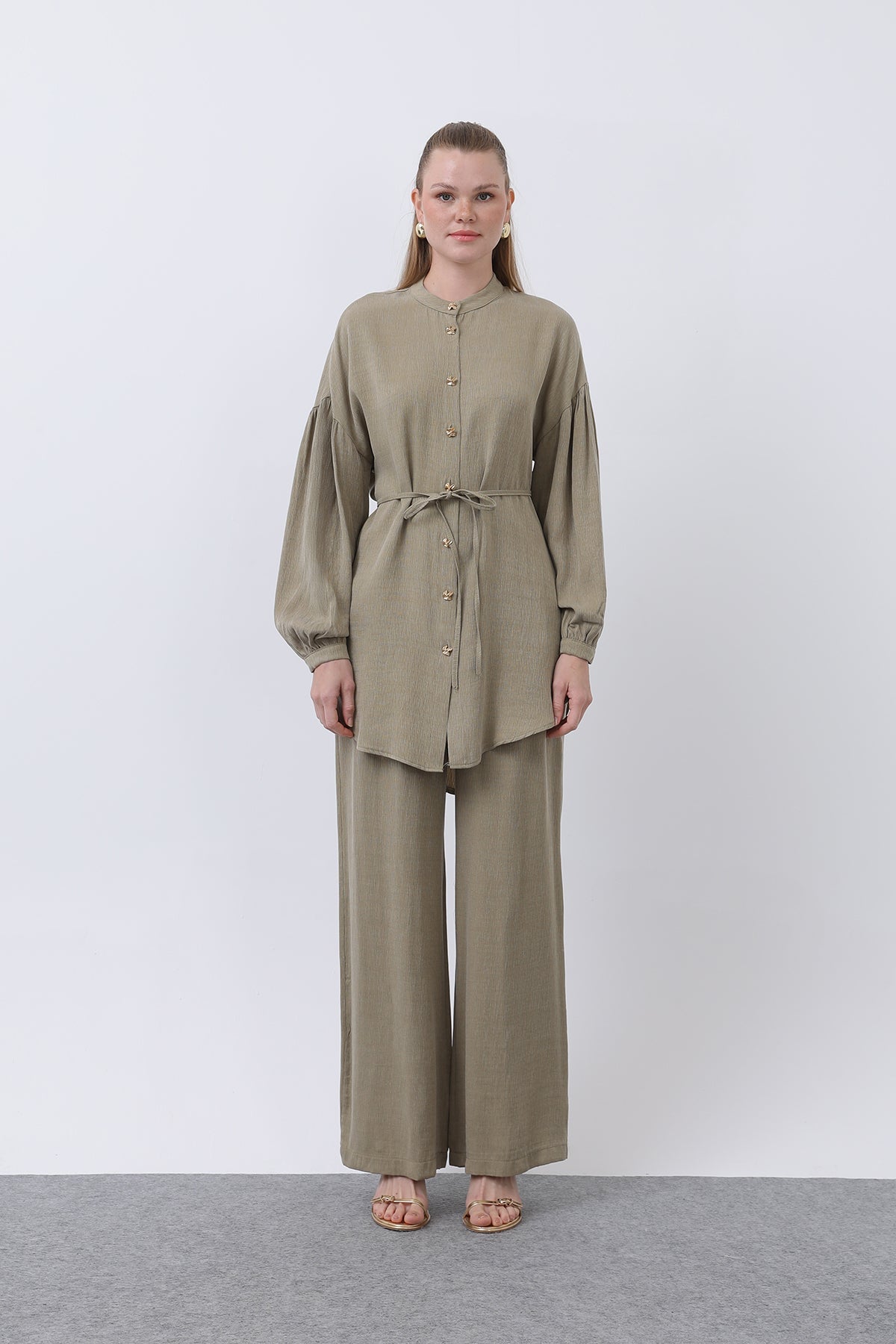 Hakim yaka detayı ve ön yüzeydeki düğmelerle hareket kazanan bu takım, tunik ve pantolondan oluşur. Takım formu sayesinde zahmetsiz bir kombin sağlar. Günlük kullanımdan ofis stiline kadar geniş bir kullanım alanına sahiptir.