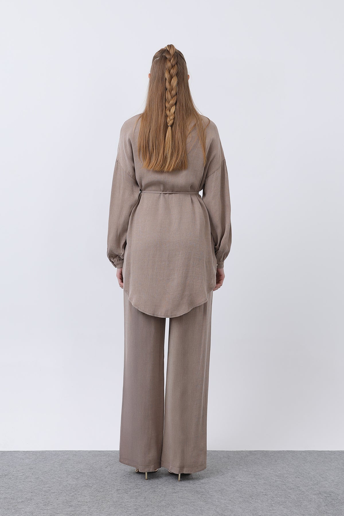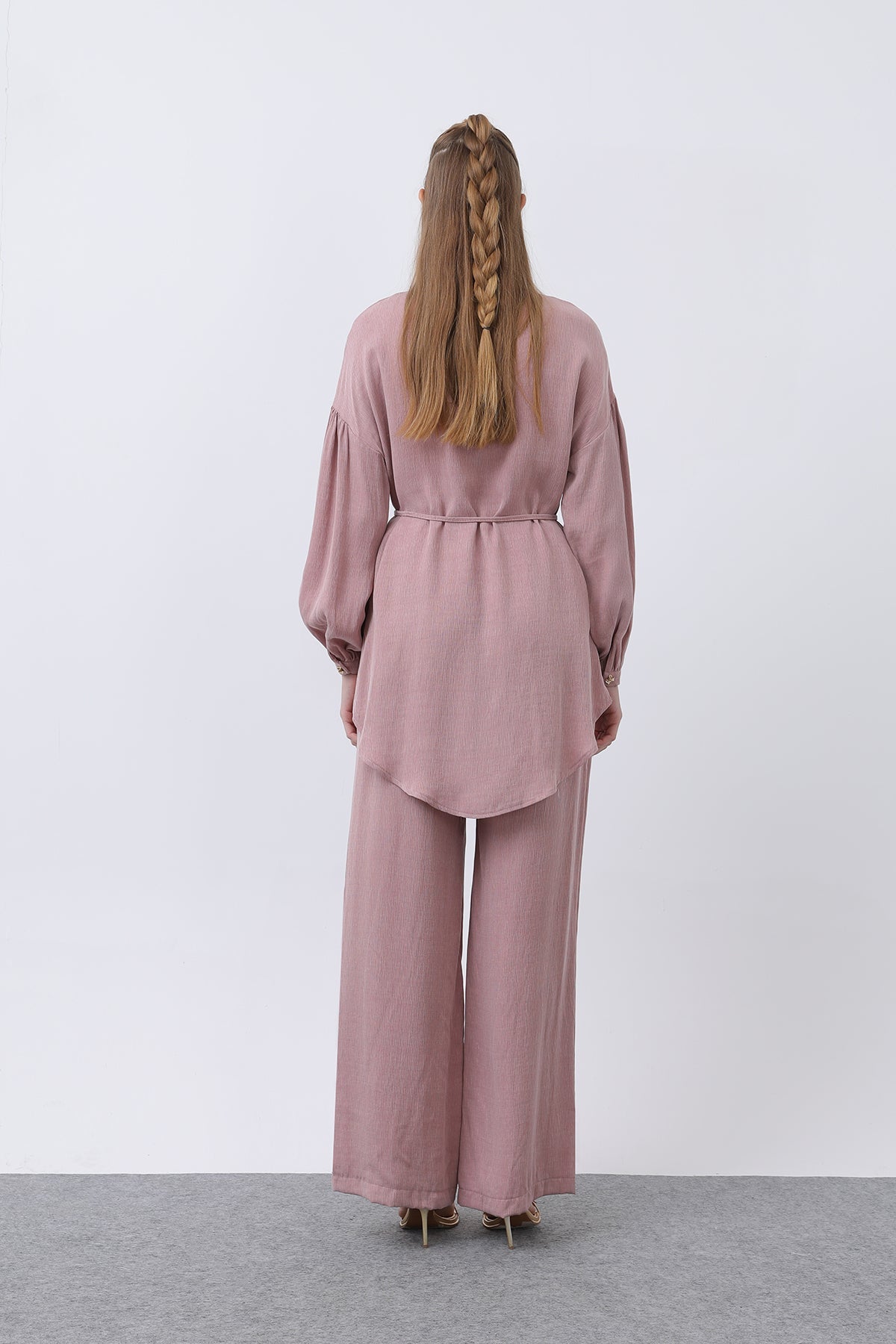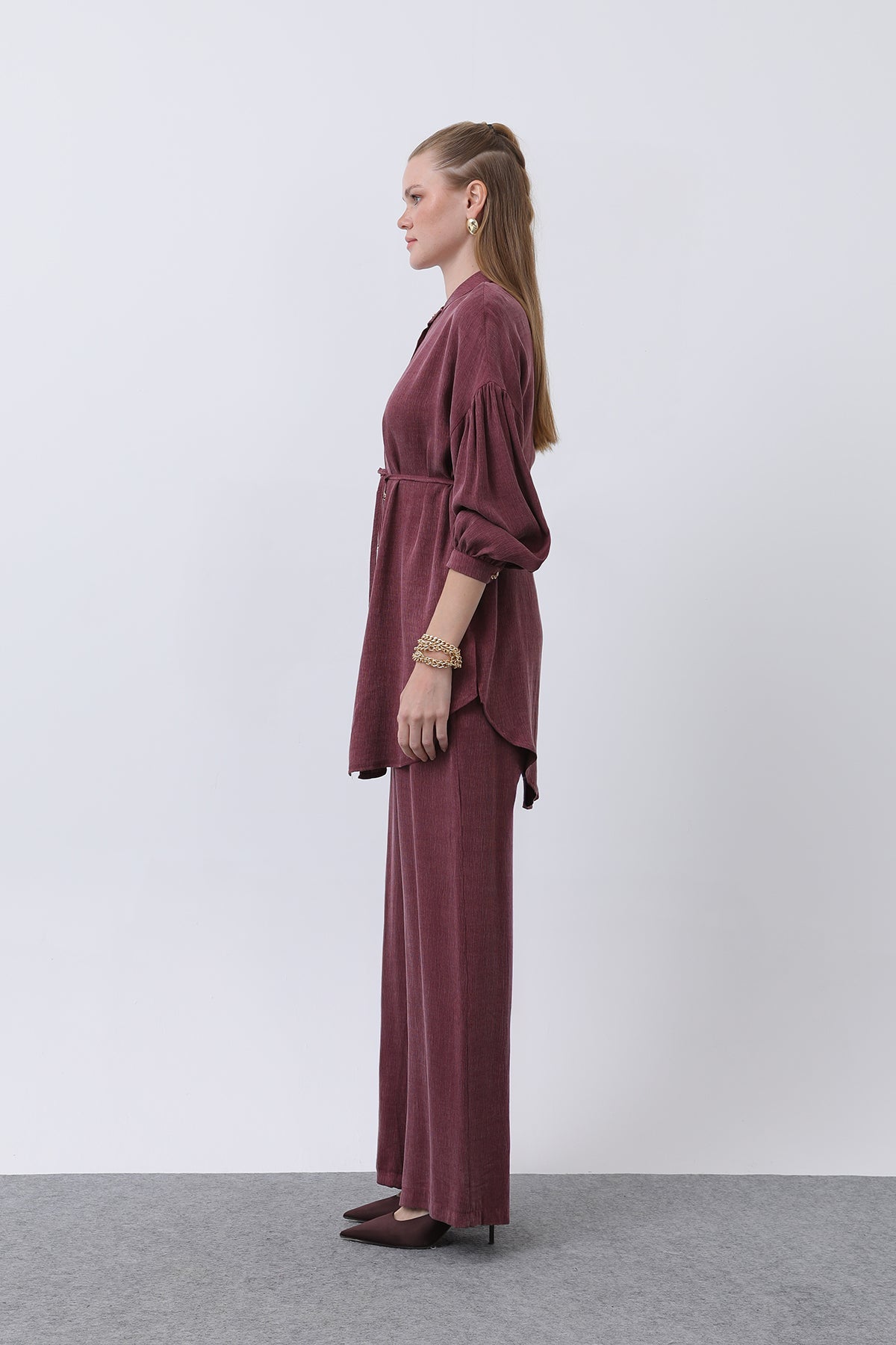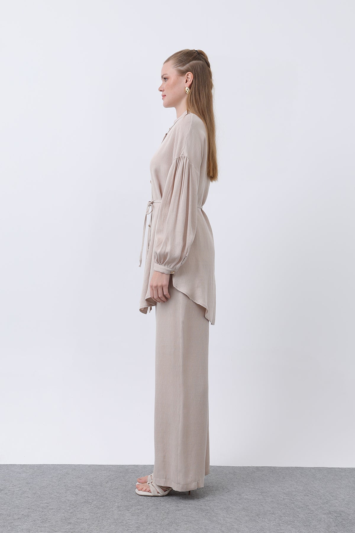 Hakim yaka detayı ve ön yüzeydeki düğmelerle hareket kazanan bu takım, tunik ve pantolondan oluşur. Takım formu sayesinde zahmetsiz bir kombin sağlar. Günlük kullanımdan ofis stiline kadar geniş bir kullanım alanına sahiptir.