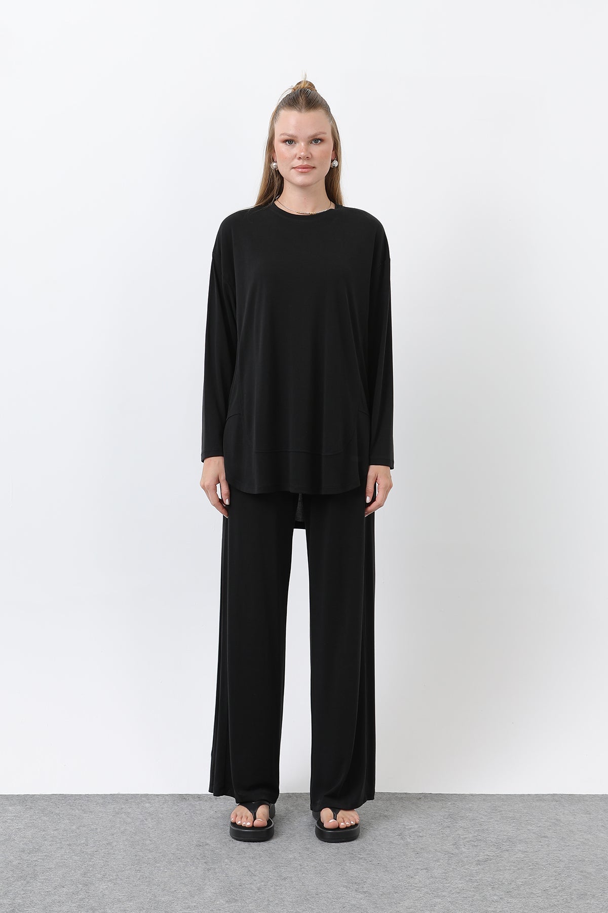 Dikiş detaylarıyla sade formuna hareket kazandıran bu takım, tunik ve pantolon uyumuyla öne çıkar. Günlük ve yarı resmi kombinlerde kullanılabilir. Rahat yapısı ve sade tasarımıyla işlevsel bir giyim alternatifi sunar.